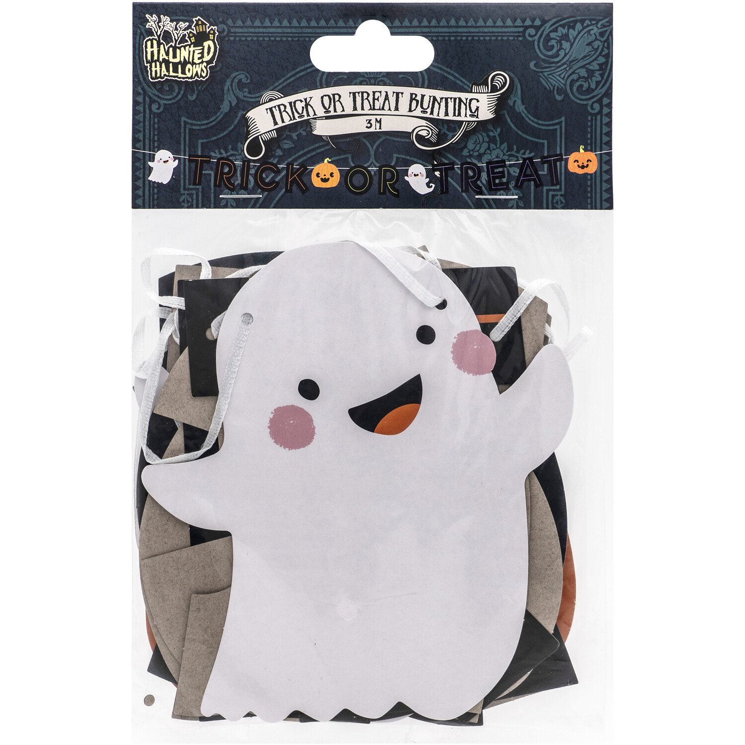Spooky, adorable and attractive, this Trick or Treat Bunting is sure to light up any party. With bold lettering alongside cut-outs of ghosts and pumpkins, this bunting makes a great addition to any Halloween setting. Pair it with matching party supplies from the collection to welcome trick or treaters in style.