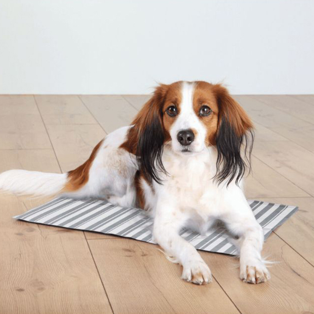 Utilizing innovative technology, the Trixie Cooling Mat for dogs and cats provides pleasant cooling through body contact. Placed in shade, it cools continuously and is quickly ready for reuse. Operating without electricity, water filling or external cooling, it suits floors, kennels, beds or cars. Made of durable polyester with a nylon feel, it's easy to clean and supports thermoregulation. Compliant with animal welfare standards under Section 18 (AT), it contains 96.8% water, 3.0% carboxymethylcellulose sodium and 0.2% preservatives in its cooling gel. To maintain effectiveness, avoid direct sunlight and temperatures above 45 degree C. Manage moisture by drying with a cloth, avoid folding or storing in the original carton. Designed in large size (65 x 50cm) in White/Grey, it ensures practical comfort for pets.