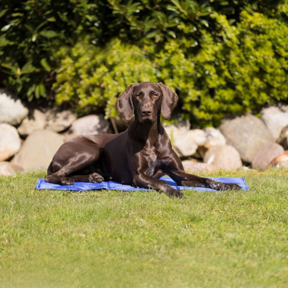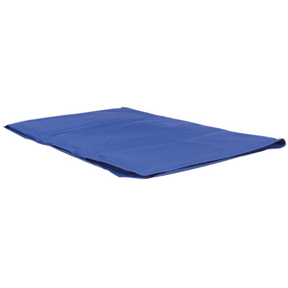 Utilizing innovative technology, the Trixie Cooling Mat for dogs and cats provides pleasant cooling through body contact. It cools for several hours and is quickly ready for reuse. Operating without electricity, water filling or external cooling, it suits floors, kennels, beds or cars. Made of durable polyester with a nylon feel, it's easy to clean and supports thermoregulation. Compliant with animal welfare standards under Section 18 (AT), it contains 96.8% water, 3.0% carboxymethylcellulose sodium and 0.2% preservatives in its cooling gel. To maintain effectiveness, avoid direct sunlight and temperatures above 45 degree C. Manage moisture by drying with a cloth, avoid folding or storing in the original carton. Designed in size extra large (90 x 50cm) in Blue, it ensures practical comfort for pets.