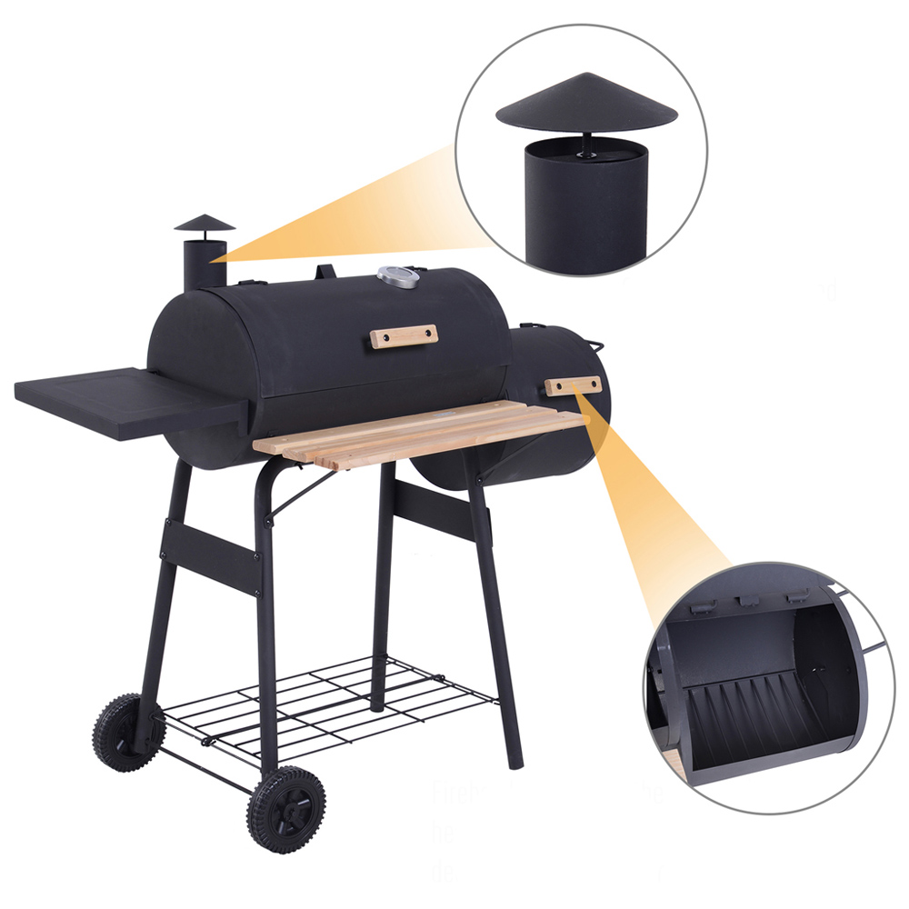 Be the master of every BBQ with this Black Trolley Charcoal BBQ Barrell from Outsunny. With an offset smoker, this BBQ and charcoal grill allows you to cook a variety of foods in no time. Easy to use, it features a thermometer on the lid to keep a close eye on the cooking temperature without lifting the lid. Finished with two wheels, you can move this BBQ around easily, making it an easy and hassle-free addition to your outdoor equipment. Apart from this, it is heat-resistant up to 1000°C to make cooking even and efficient. The unit comes complete with two handy shelves on the side and bottom for storing food, condiments, cutlery, and more. Size: 124 x 104 x 53cm. Keep your BBQ covered and protected with our range of premium BBQ covers.