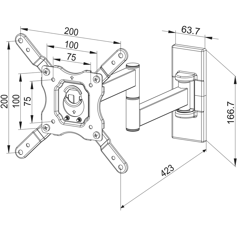Fully adjustable TV bracket, extending from 58 mm to 423 mm from the wall. Suitable for small to medium TVs with a screen size between 10” and 43” and a weight up to 20 Kg. Tilt your TV -5º to +15º and swivel 90º left and right with soft touch precision level adjustment for perfect viewing and cable management system to keep wires tidy. The additional extension arms fit a wide range of TV and VESA sizes from 75 x 75 to 200 x 200.