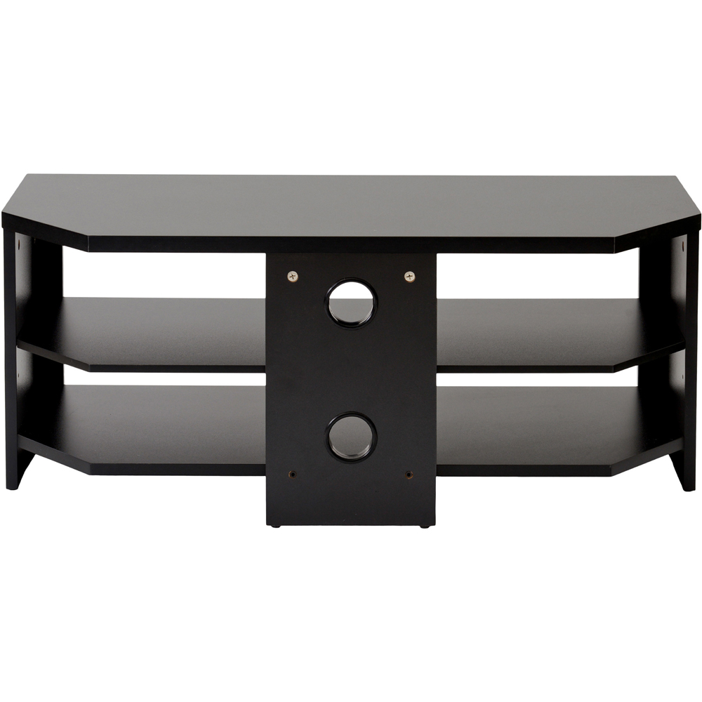 The Memphis TV stand is a stylish black TV stand with angled corners, ideal for positioning in room corners or against a wall. It includes a height-adjustable middle shelf, which gives plenty of flexible storage space for electronic accessories, such as a DVD player, satellite box or soundbar, and a cable management leg on the rear of the stand hides unsightly cables. Sturdily constructed, the Memphis TV stand will hold a maximum weight of 45 kg on the top, 15 kg on the middle shelf and 25 Kg on the lower shelf. Suitable for most TVs up to 55” (TV size is a recommendation only. Please check the size of the TV's pedestal/feet before purchase.)