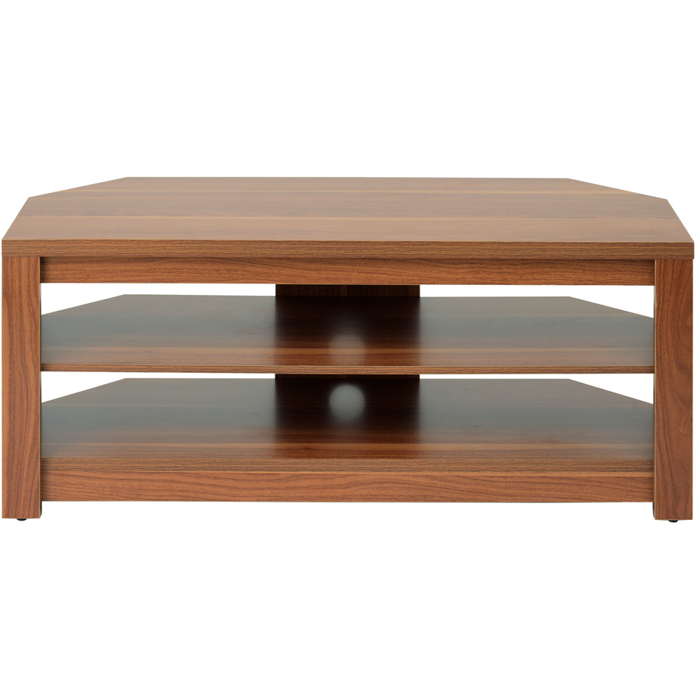 The Memphis TV stand is a stylish walnut wood-effect TV stand with angled corners, ideal for positioning in room corners or against a wall. It includes a height-adjustable middle shelf, which gives plenty of flexible storage space for electronic accessories, such as a DVD player, satellite box or soundbar, and a cable management leg on the rear of the stand hides unsightly cables. Sturdily constructed, the Memphis TV stand will hold a maximum weight of 45 kg on the top, 15 kg on the middle shelf and 25 Kg on the lower shelf. Suitable for most TVs up to 65” (TV size is a recommendation only. Please check the size of the TV's pedestal/feet before purchase.)