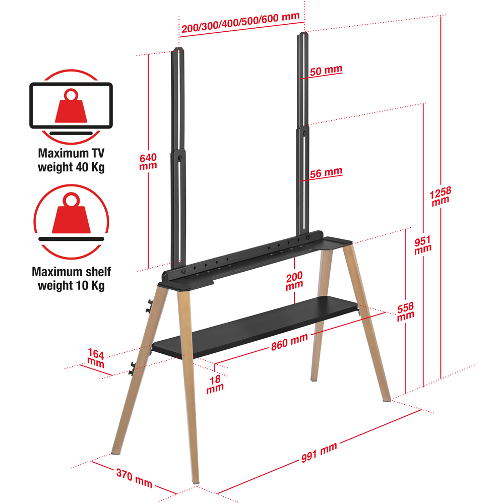 The Roma Easel TV Stand has a sleek, stylish design with smart features, offering a modern and contemporary design for your living space. Constructed from high-quality materials, the Roma includes a shelf for accessories or a soundbar and cable management to keep TV cables tidy. The Roma can accommodate TVs from 49” to 75” weighing up to 40 Kg and the shelf 10 Kg. This product includes an anti-tip kit to be used with this product, which will prevent it from falling or tipping over.