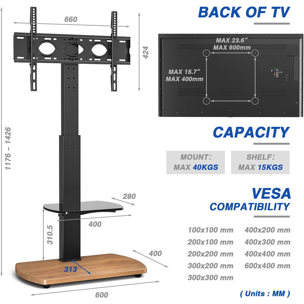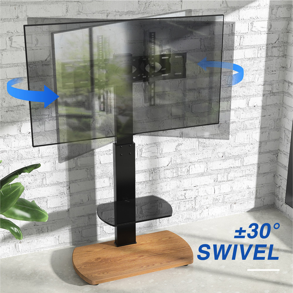 The TTAP FS1 TV floor stand has a modern, stylish oak base with a black pedestal and glass shelf. It is an ideal alternative to attaching your TV to the wall and is suitable for any room within the house or even commercially in an office. The compact design allows it to be placed close to the wall or in a corner. It can accommodate TVs from 32 – 65 inches and comes with a wide range of VESA fitting options. It features height adjustment and 30 degrees of swivel adjustment, enabling you to find the perfect viewing position for your TV. It has plenty of onboard storage for electronics such as a satellite box, games console or DVD player and includes a cable management system to neatly manage the cables and wires at the rear of the stand. Please measure the VESA sizes on the back of your television before purchasing. It fits VESA sizes ranging from 100 x 100 to 600 x 400. Includes a wide range of TV fixing bolts for mounting your television onto the stand and easy-to-follow assembly instructions.