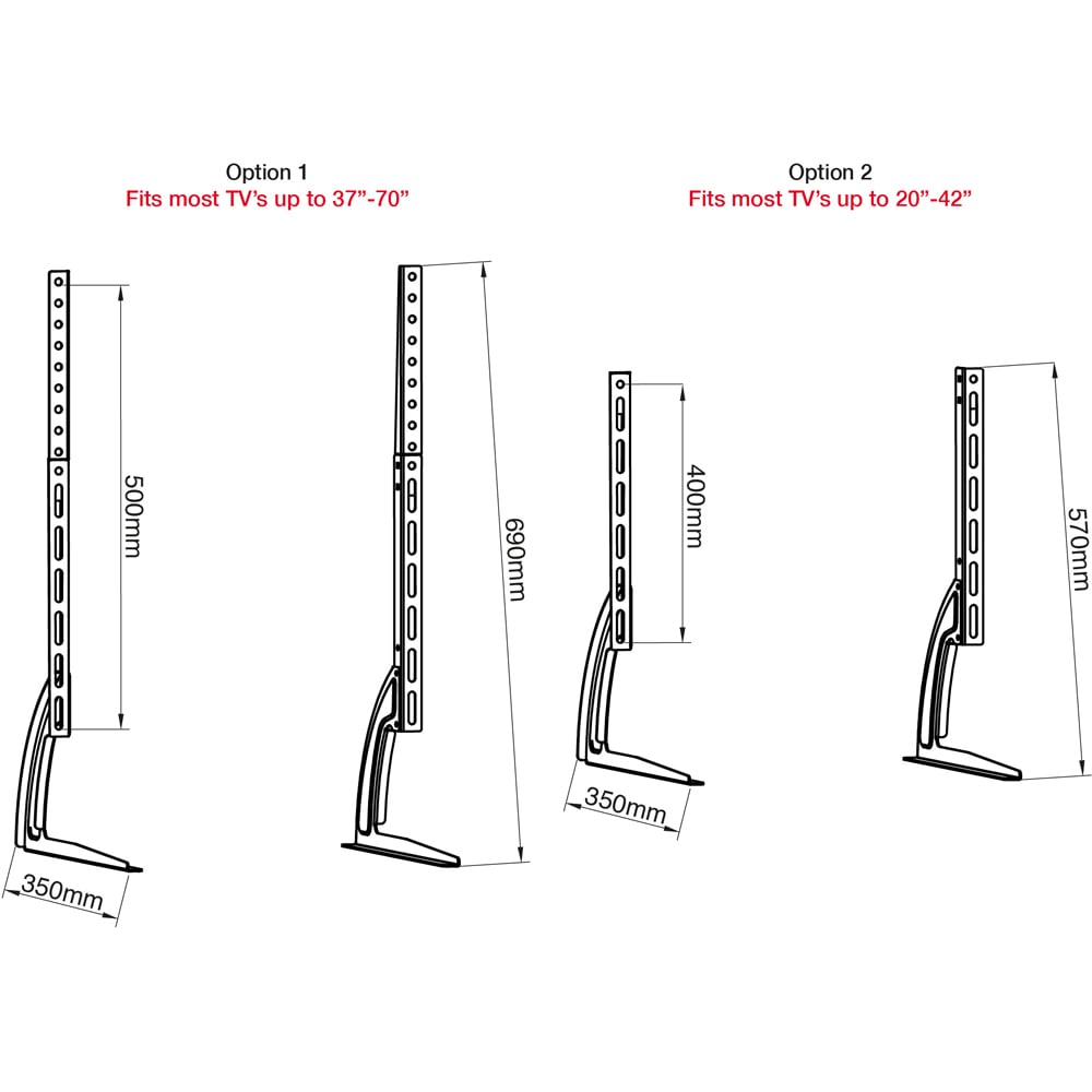 The TTAP TTDUNIV-1 is a space-saving budget replacement TV stand that uses the VESA mounting holes found on all TVs. Ideal when the original TV stand is broken, damaged, lost or when re-using a previously wall-mounted TV without a base. Extendable arms make the TTDUNIV-1 suitable for a wide range of TV screen sizes between 20” and 70” and weighing up to 40 Kg. Non-slip pads on the feet ensure your TV is stable. Simple assembly, all fixings included.