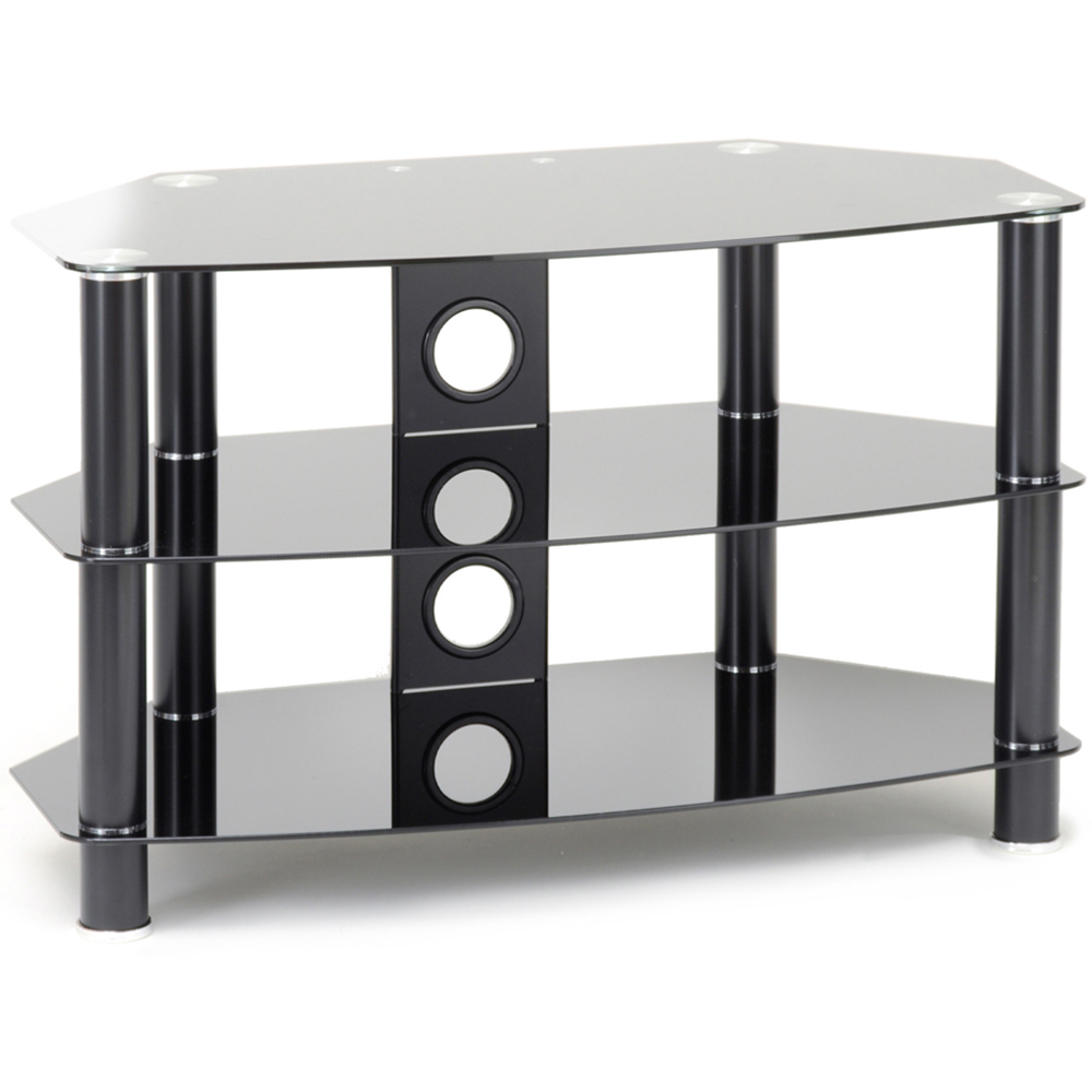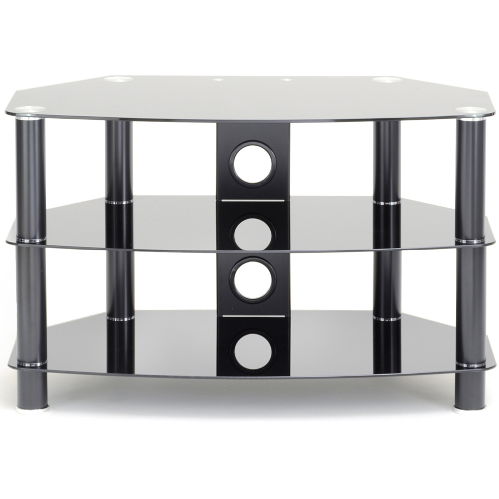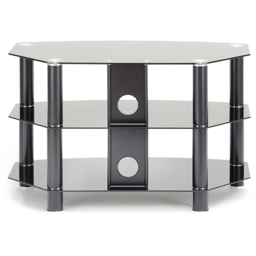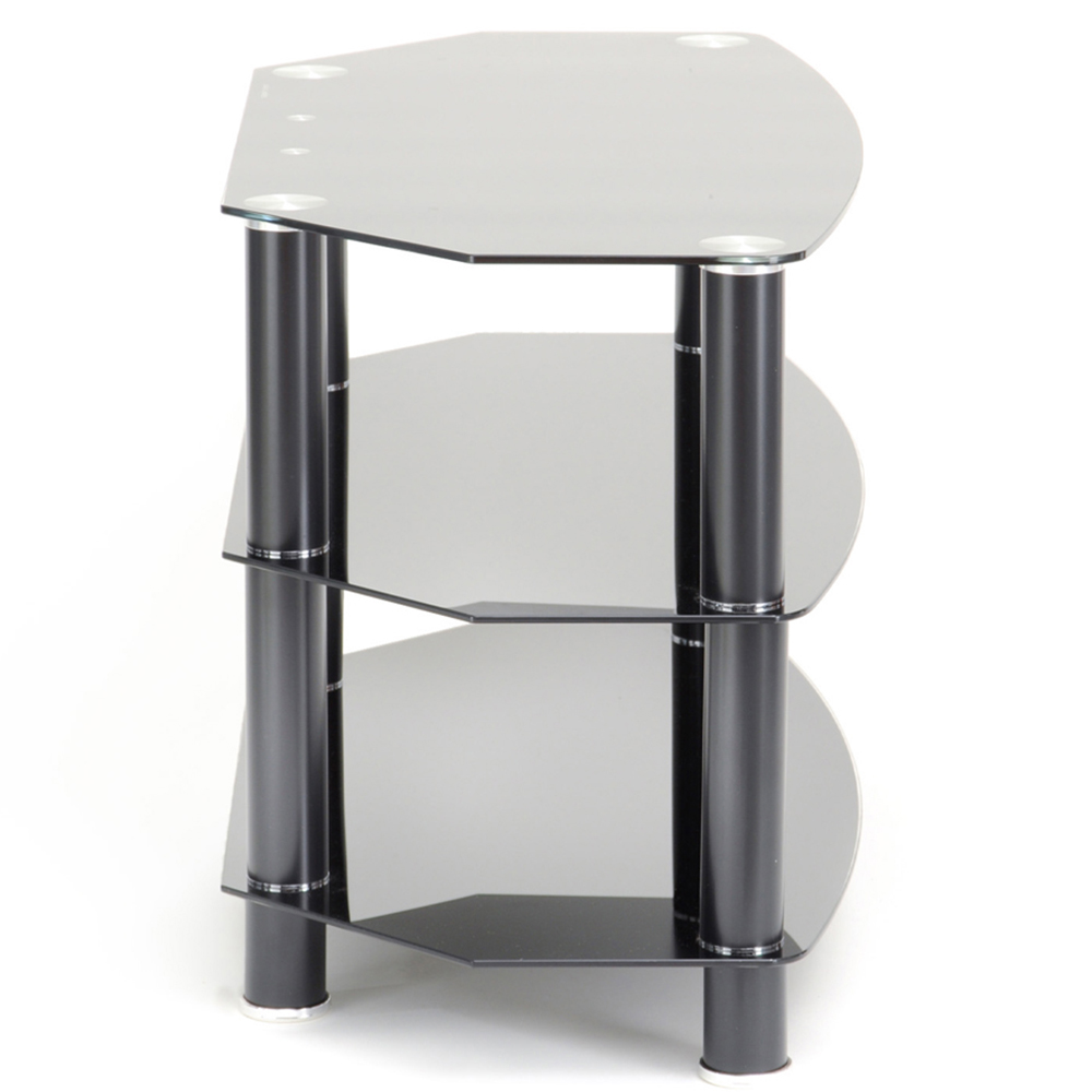 Modern and minimalist, the Vantage TV stand will create an eye-catching focal point in your living room. It is finished with black tubular aluminium legs and black glass. The chamfered corners mean the stand is ideal for positioning in the corner of the room but also looks good against a living room wall. The three curved glass shelves give plenty of storage space for your electronic accessories, such as a DVD player, satellite box, game console and soundbar. The glass shelves are toughened to BS6206A and will hold a maximum weight of 70 kg on the top glass shelf and 12 Kg on the middle and bottom shelves. Suitable for most TVs up to 49” (TV size is a recommendation only. Please check the size of the TV's pedestal/feet before purchase.)