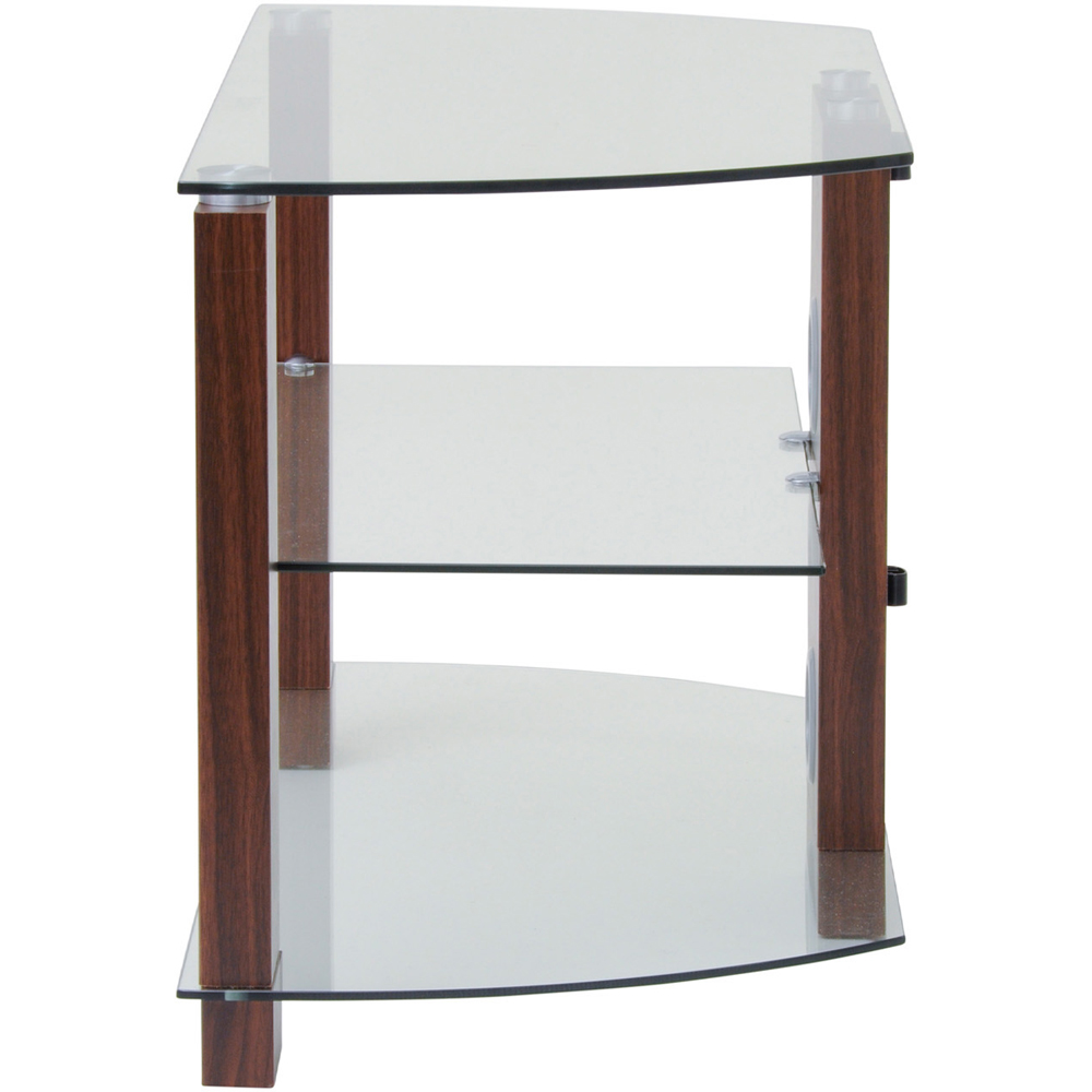 Simple and modern, the Vision TV stand will create an eye-catching focal point in your living room. It is finished with walnut wood-effect grain legs, which complement the three clear curved glass shelves giving plenty of storage space for your electronic accessories such as a DVD player, satellite box, game console and soundbar. The cable management leg on the rear hides unsightly wires. The glass shelves are toughened to BS6206A and will hold a maximum weight of 70 kg on the top glass shelf and 8 Kg on the middle and bottom shelves. Suitable for most TVs up to 49” (TV size is a recommendation only. Please check the size of the TV's pedestal/feet before purchase.)