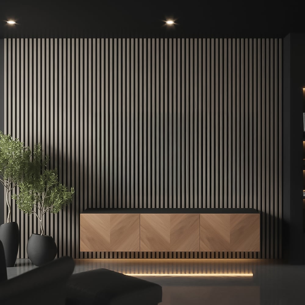 Premium acoustic slat panels are an effective way to create a classic feature wall. This range of PVC wood pattern veneer slats is attached to a recycled PET felt backing.  These panels absorb sounds and help to reduce noise reverberation in your room, improving the quality by absorbing the echoes and reflection.