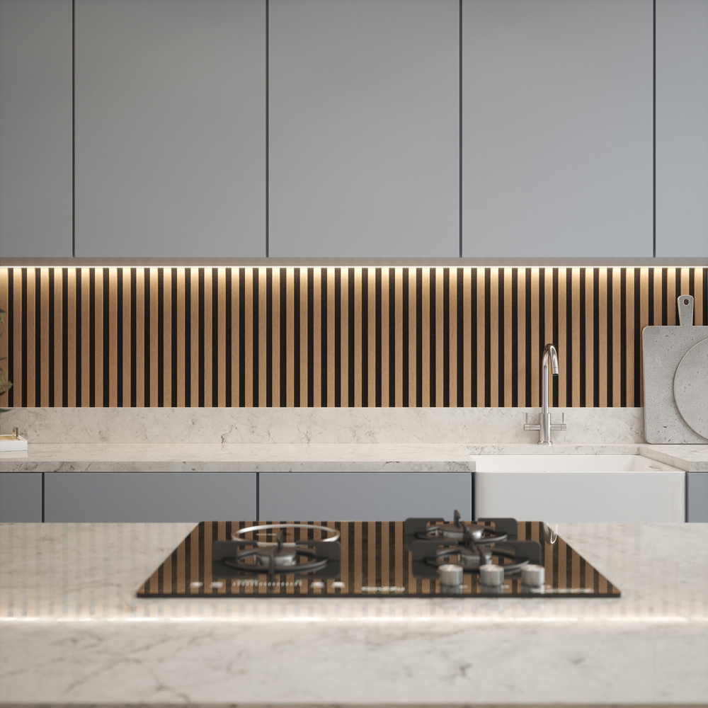 Premium acoustic slat panels are an effective way to create a classic feature wall. This range of PVC wood pattern veneer slats is attached to a recycled PET felt backing.  These panels absorb sounds and help to reduce noise reverberation in your room, improving the quality by absorbing the echoes and reflection.