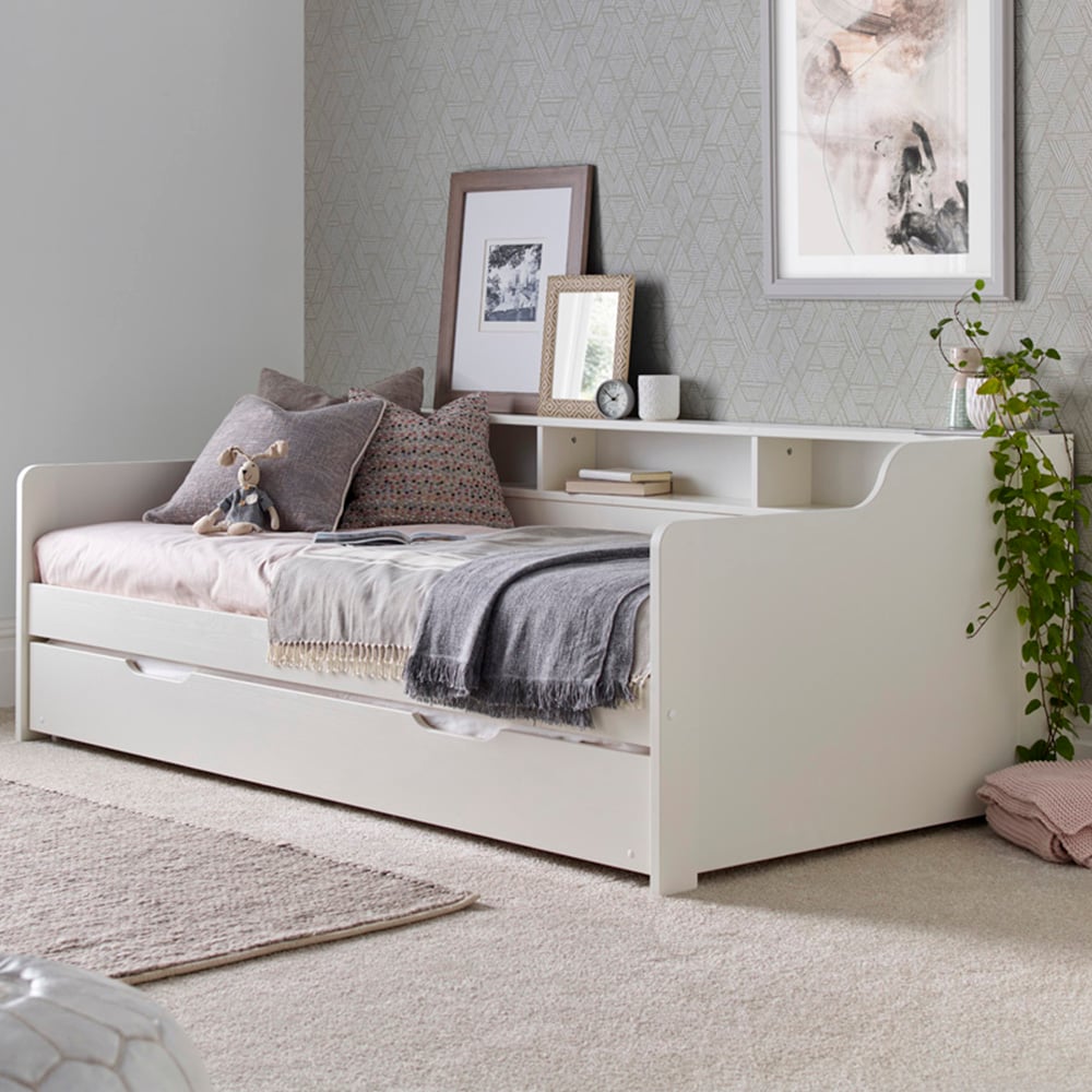 The Bedmaster Tyler Single White Bed and Trundle with Memory Foam Mattresses has a simple, stylish design. It offers an excellent addition to both bedrooms and guest rooms. It's a durable bed made from solid pine with shelves and wooden slats for mattress support, with 15.5cm depth. The trundle can easily be pulled out to create an extra sleeping area for another person. The trundle measures 23 x 194 x 93cm, which can also be removed and used anywhere. It fits single size mattresses, and comes with two single Bedmaster Noah Memory Foam Spring mattresses. Supplied flat-packed to a room of choice. Self-assembly is required. Turn and rotate the mattress regularly. It is tested with adherence to BS7177.