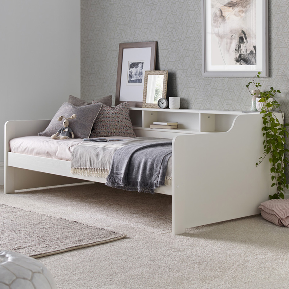 The Bedmaster Tyler Single White Bed with Memory Foam Mattress has a simple, stylish design. It offers an excellent addition to both bedrooms and guest rooms. It's a durable bed made from solid pine with shelves and wooden slats for mattress support. This is the ‘no trundle’ version with 15.5cm depth. Fits single size mattresses. It comes with single Bedmaster Noah Memory Foam Spring mattress. Supplied flat-packed to a room of choice. Self-assembly is required. Turn and rotate the mattress regularly. It is tested with adherence to BS7177.