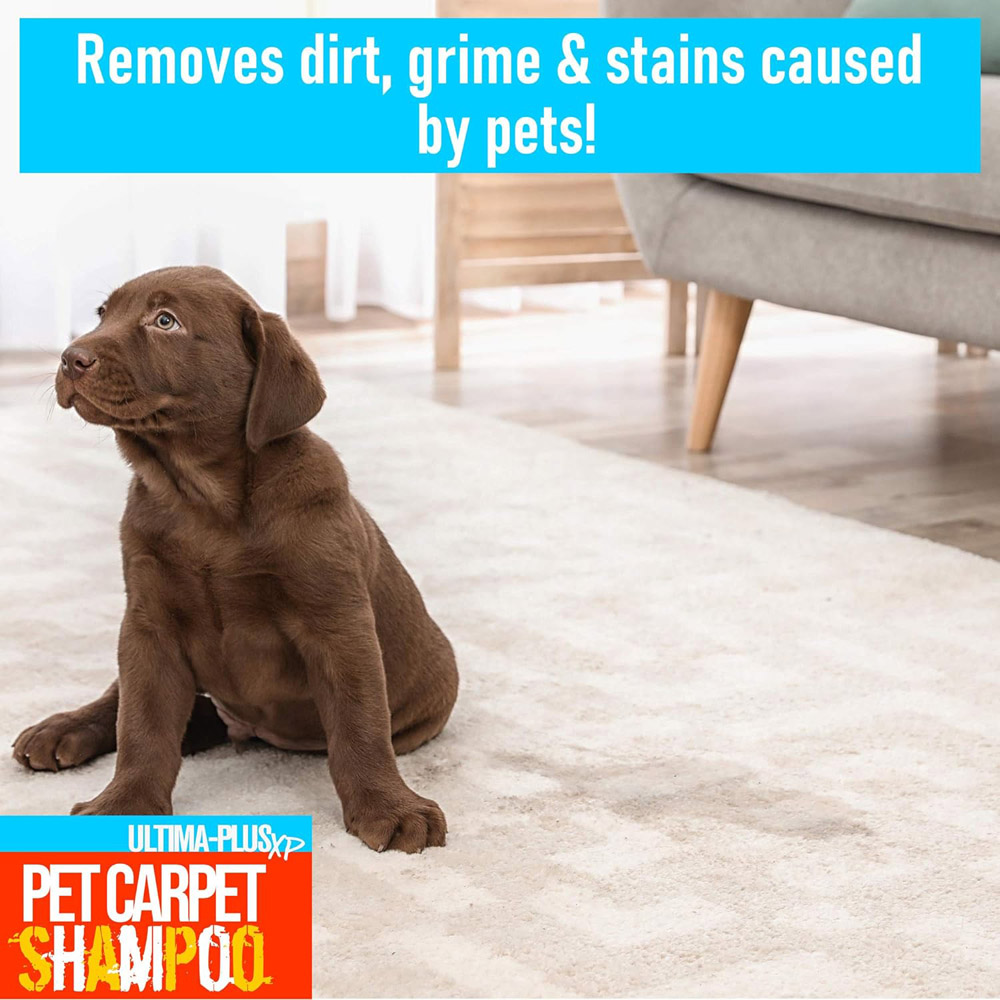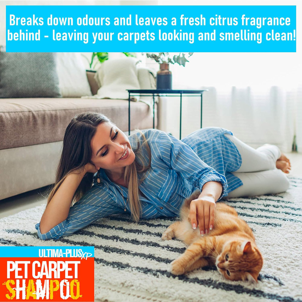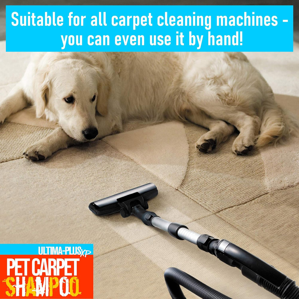 Keep your carpets fresh and stain-free with the Ultima-Plus XP Pet Carpet Shampoo 5L. This powerful cleaner penetrates carpet fibres and effortlessly lifts deep-rooted dirt and odours. It is safe for use on all carpet types, including wool and car carpets. Its super-concentrated formula needs only 30 to 50ml per use, plus, with an anti-re-soiling agent, it helps prevent future stains too. How to Use: With a carpet cleaning machine – follow the manufacturer’s instructions carefully. Once dry, vacuum for an odour-free, sparkling finish. If you’re using by hand – depending on the level of soiling, dilute 30 – 50 ml of the cleaning solution with 1 litre of water. Brush, spray or sponge onto the stained areas and simply wipe away or vacuum once dry. Please follow the additional instructions on the back of the bottle.