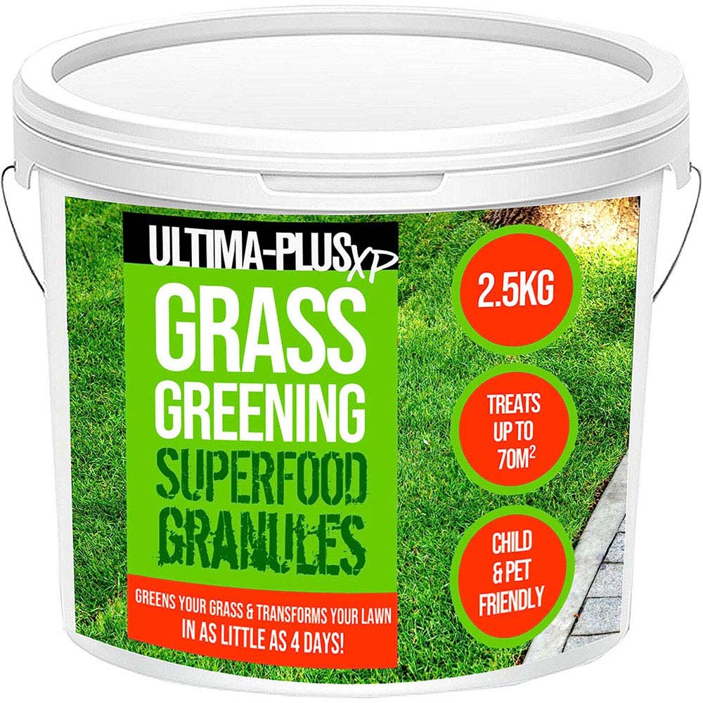Make your grass healthier, thicker and greener with Ultimate Plus XP Grass Greening Superfood. This plant food is full of NPK nutrients to ensure your lawn looks better than it ever has before! With Ultima-Plus XP Grass Green, transform your lawn in just four days! This makes it the perfect product to use when the warmer weather starts to arrive – especially if your lawn needs some TLC to prepare it for the nicer weather. Not only does this product transform your grass quickly, but it also offers excellent value for money. Just one 2.5kg tub treats up to 70 square metres! (Applying 25-35g per metre). If you want to transform your lawn but are worried about potentially causing harm to your children or pets due to harsh chemicals, this is the perfect product for you! It’s a child and pet-friendly formula – sure to safely give you healthier-looking grass. How to Use: Apply using a lawn spreader or by hand. Apply 25-35g per square metre. Apply between March and October for the best results. Avoid applying during hot weather or long periods of drought. For best results, apply in damp conditions or when rain is expected in the next 24 hours. Allow the granules to settle into the grass for at least 2-3 days before mowing. If there is no rain after 2-3 days, the granules need to be watered in.