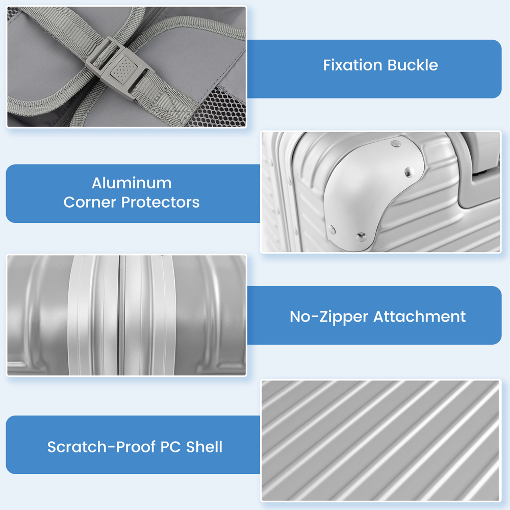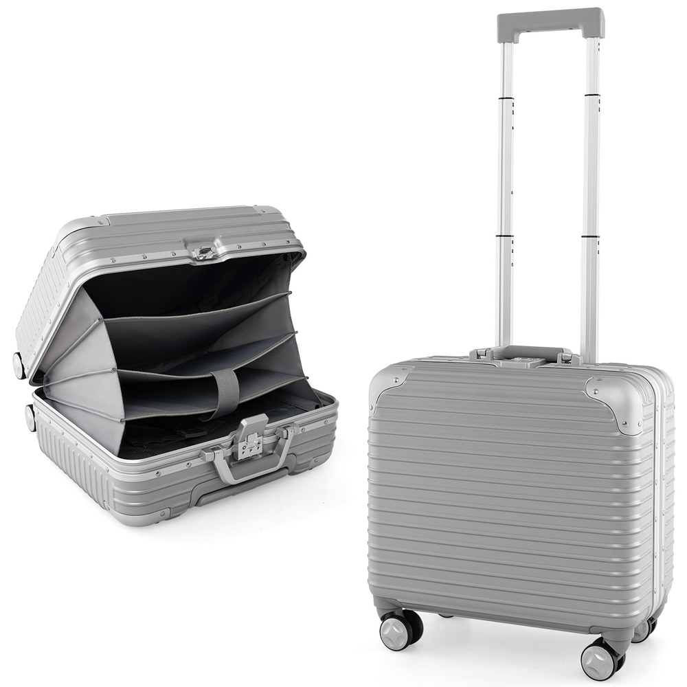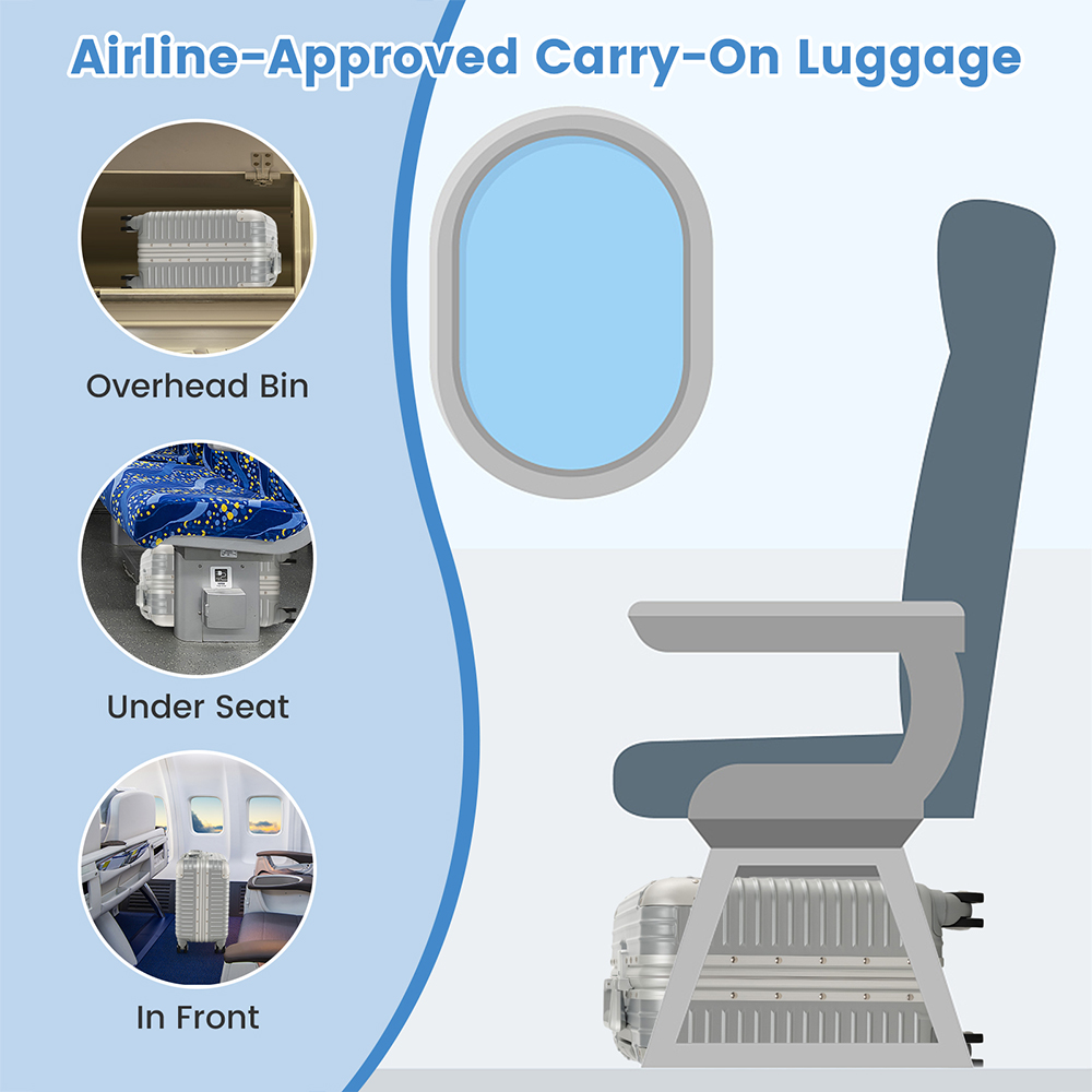 Travel in comfort and style with the Costway Silver Under Seat Carry On Luggage. The carefully selected PC material used in this carry-on luggage provides exceptional durability and scratch resistance, ensuring a longer lifespan. The spacious interior is perfect for organising all your travel essentials, and it even includes a detachable 15 inch laptop pocket for added convenience and protection. The upgraded TSA lock makes it easy to pass through customs security checks in most international countries. For ease of use, the telescoping handle is designed to accommodate individuals of varying heights, while the durable spinner wheels allow for smooth movement across different surfaces. This airline-approved under-seat carry-on luggage is both lightweight and robust. Additionally, the inclusion of four aluminium corners provides extra protection. The luggage also features a spacious 34L storage capacity for clothing and other items, along with a separate pocket to keep your laptop and tablet well-protected. The 360° durable spinner wheels ensure easy, quiet, and low-friction movement across various terrains, from asphalt and cobblestone roads to speed bumps. With its ergonomic telescopic handle, and no-zipper design featuring a waterproof rubber strip, this carry-on suitcase is thoughtfully designed to save time during customs security checks and protect your belongings. Weighing just 8 lbs, this carry-on luggage is perfectly sized for overhead compartments or under-seat storage and is approved for use on airlines.