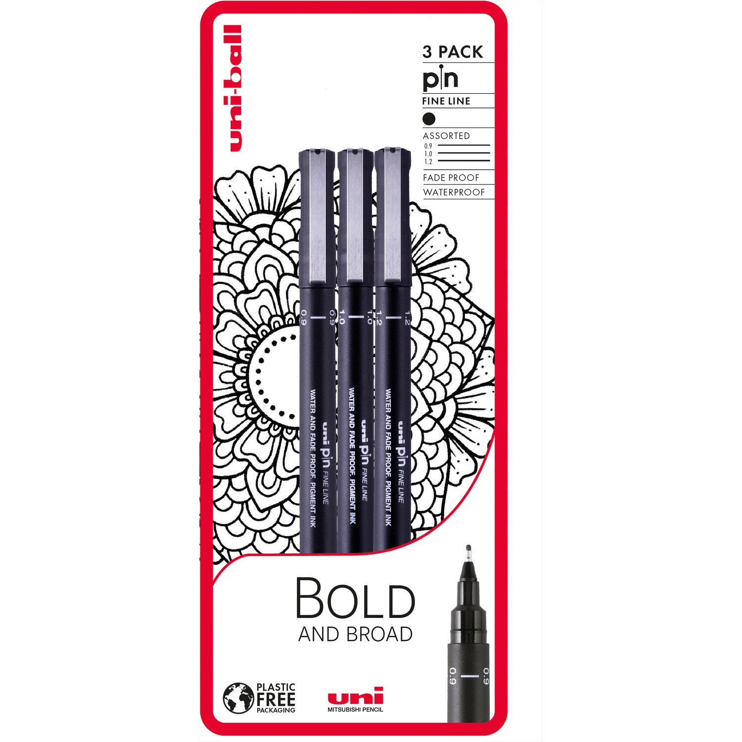 The Pack of 3 Uniball Pin Drawing Pens contains pens that are ideal for all types of art and design. Contains Super Ink, which is fade resistant, water resistant and tamper proof.