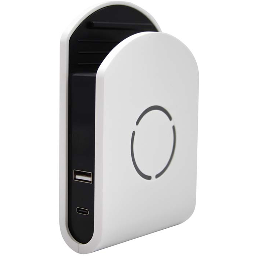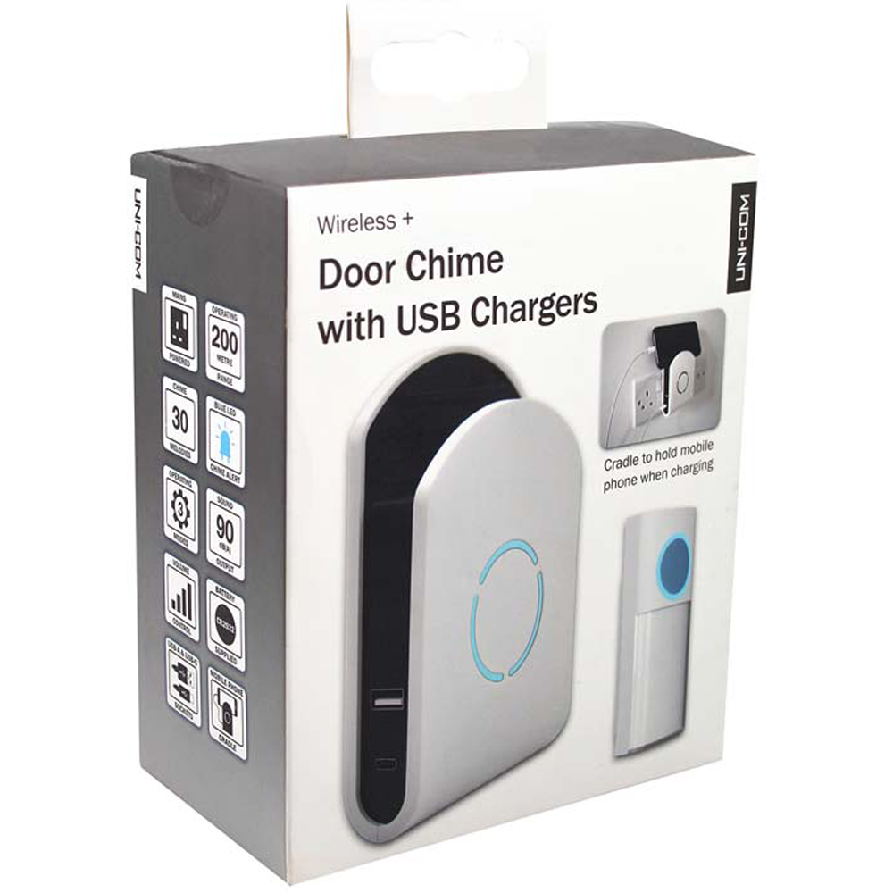Uni-Com Plug-in Door Chime with USB-A and USB-C ports plus handy shelf to hold your mobile phone while charging. Ideal for use around the home, plugs into any 13A socket around your home.