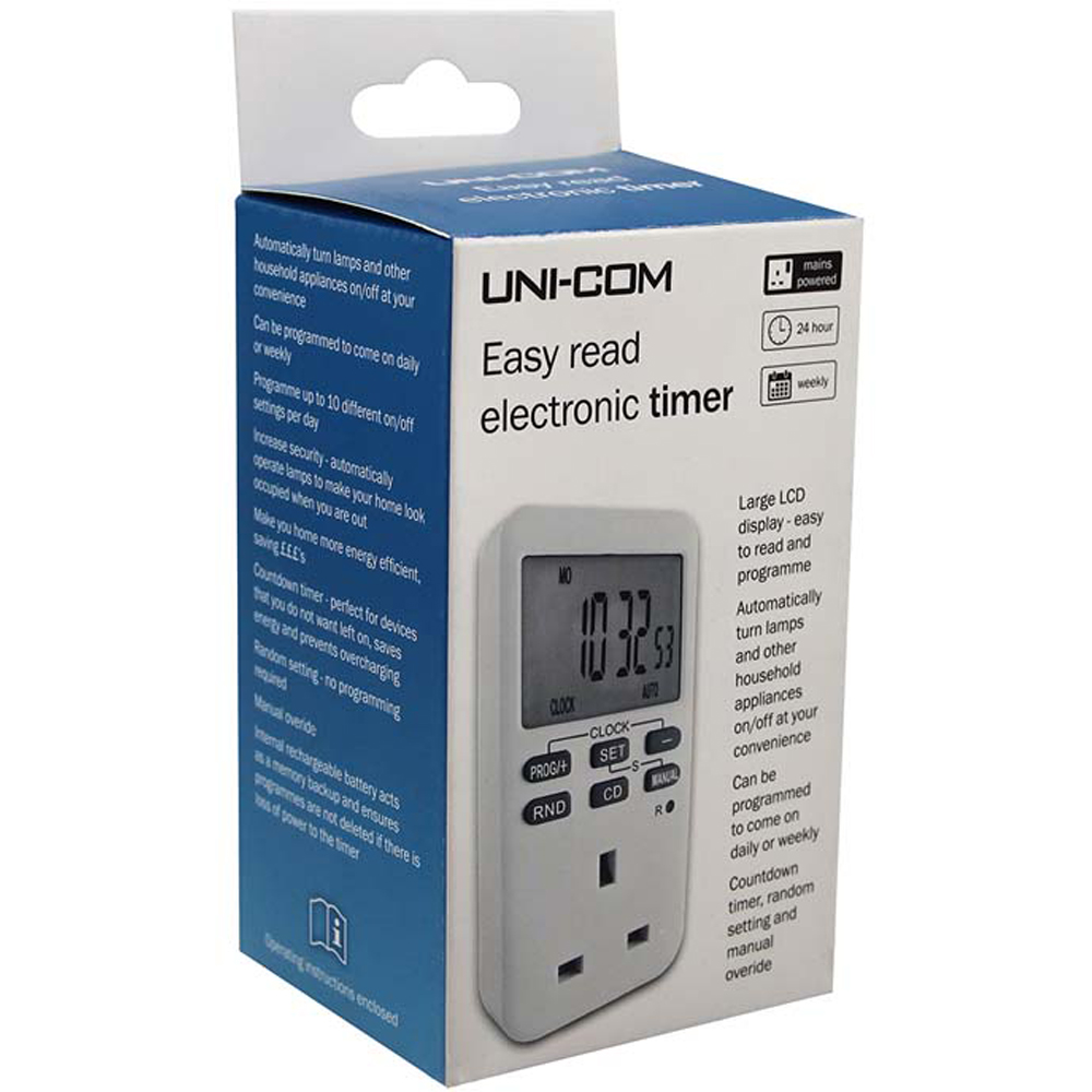 The Uni-Com Easy Read Electronic Timer has a large LCD display that is easy to read and programme. Can be programmed to come on daily or weekly, up to 10 different on and off settings per day.