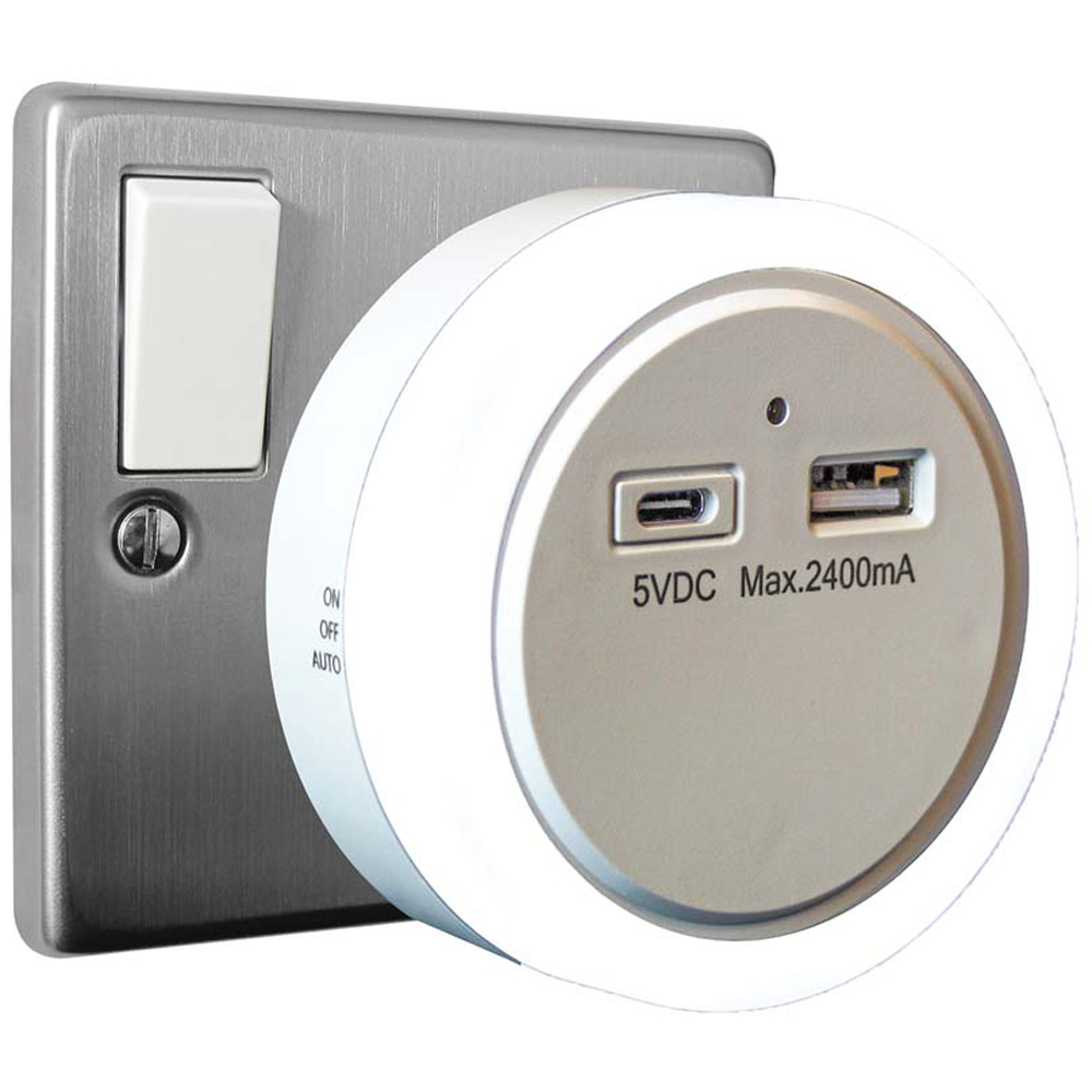 Uni-Com Night Light with built-in USB-A and USB-C sockets. Allows you to charge your mobile phone or other devices from the same mains socket. Provides a soft white light which automatically switches on when it gets dark, and off when daylight returns. You can choose to have the unit in auto night light mode, the light permanently on, or the light switched off.