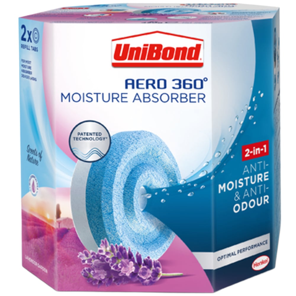 Get long-lasting and efficient moisture control with the UniBond AERO 360 Moisture Absorber Neutral Refill Tabs! With innovative 2-in-1 technology, these tabs absorb excess moisture and neutralise bad smells. Each tab features a patented wave shape with ultra-absorbing active crystals while the anti-odour agents help prevent damp problems such as condensation, mould and musty smells to create a healthy indoor climate. This set of two tabs is compatible with most moisture absorbers with a capacity of at least 450g. Directions to use: Push the open button on the top of the device and slide it open. Open the UniBond dehumidifier refill tab packaging. Place the refill onto the open lid with the blue side facing downwards and close the device. Once the tab is fully dissolved, open the spout and pour the salty solution into the toilet. Repeat the process with a new tab.