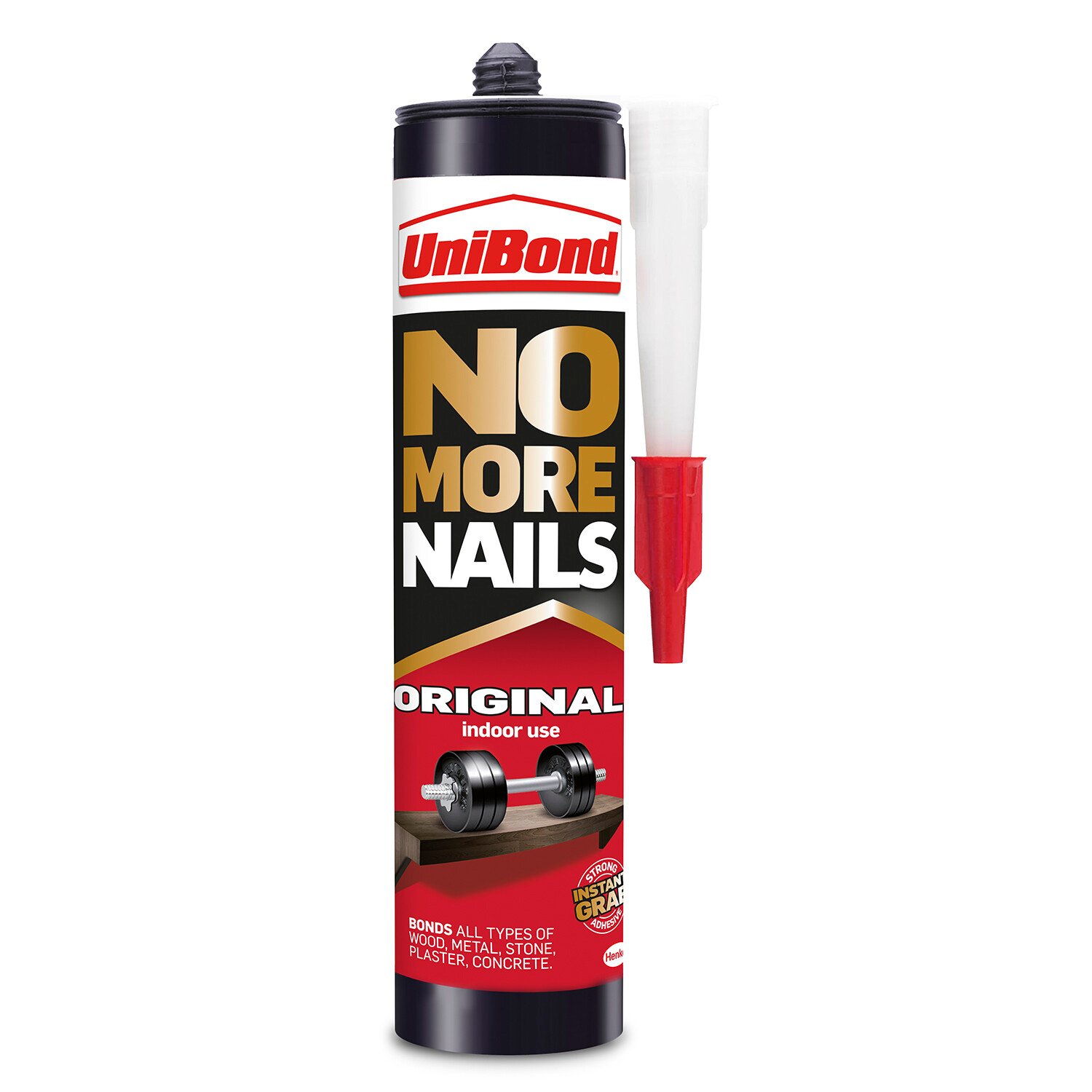 Are you tired of having to use nails and screws during DIY or repair jobs? Unibond No More Nails Original construction adhesive is a heavy duty adhesive ideal for mounting and bonding, without the need for nails, screws or hassle. The mounting adhesive is constructed with water-based copolymer technology, ensuring extra-strength and a professional finish. The cartridge design ensures a simple application, allowing control of the flow of glue with the use of a cartridge gun. The grab adhesive is suitable for most common building materials, e.g. wood, ceramic, metal, concrete, brick, plaster, stone and most plastics. Specially designed for interior use, the grab glue ensures strong bonds for heavy-duty repair and DIY jobs in almost any capacity ideal as a skirting board adhesive and for many other internal bonding applications, including fixing coat hooks, window ledges and coving.