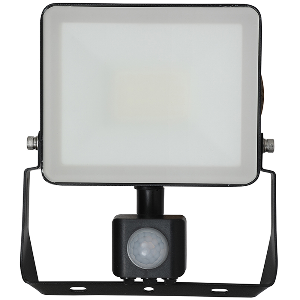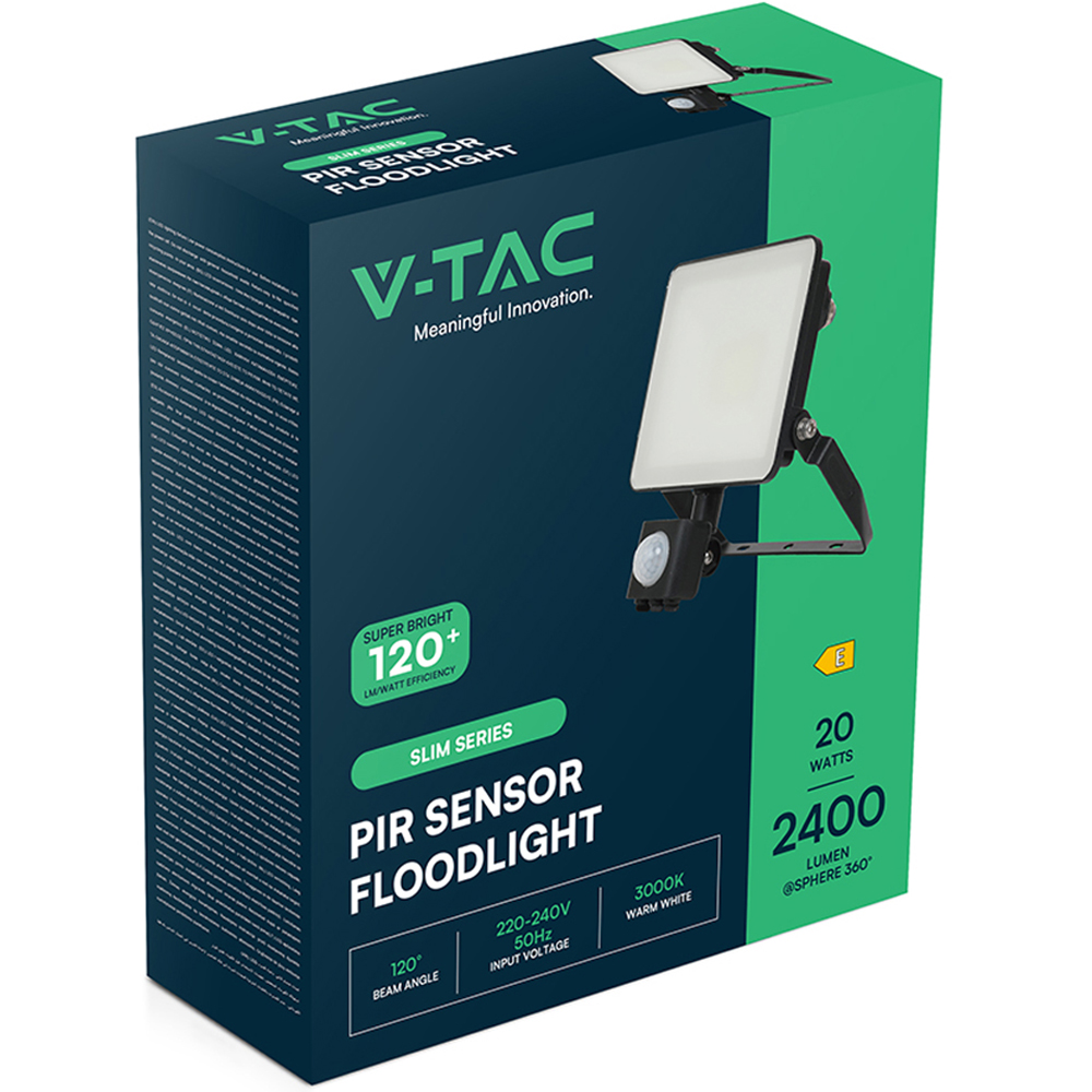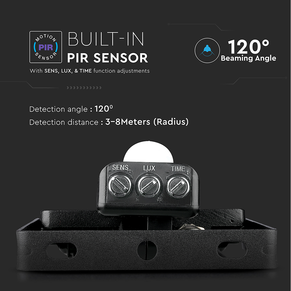 Brighten your outdoor area with the V-TAC 20W 2400 Lumens Daylight White LED Floodlight with PIR Sensor. It is a high-performance outdoor lighting solution featuring a built-in adjustable PIR sensor with sensitivity, lux, and time controls, along with a manual override for continuous illumination. With a wide 120° detection angle and a range of 3–8 meters, it’s ideal for mounting at heights between 1.8–2.5 meters. Delivering 2400 lumens at 6500K warm white using high-efficiency SMD chips (120 lm/W, CRI >70), it ensures instant brightness in under a second. Its slim, corrosion-resistant aluminium body is IP65 rated for durability in outdoor environments, backed by a 25,000-hour lifespan and a 2-year warranty. Installation is simple with a 1-meter pre-wired cable, making it perfect for lighting up parking spaces, driveways, garages, patios, gardens, and other exterior areas.