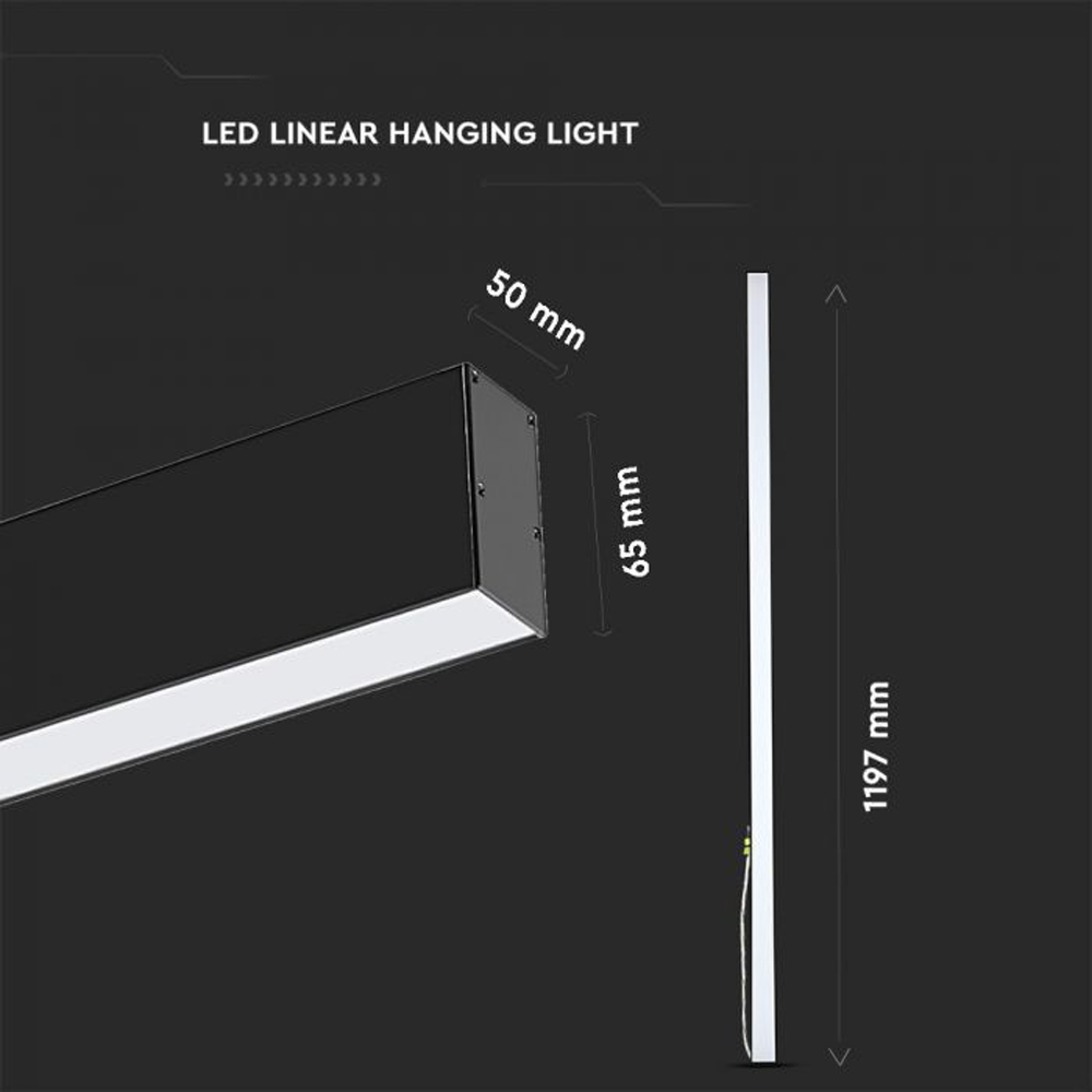 Sleek and efficient, the V-TAC 40W Linear Hanging Suspension Light is the ideal solution for commercial and office spaces requiring high-performance, low-glare illumination. Designed with premium LED chips, this fixture delivers a long lifespan of up to 30,000 hours while offering the flexibility of three colour temperature options to suit your environment. With a built-in toggle switch, you can easily choose between warm white (3000K, 1900lm), cool white (4000K, 2500lm), or daylight white (6400K, 2200lm). It features a UGR<19 rating to minimise glare—perfect for workplaces where visual comfort matters. The fixture is linkable in a straight line and comes with a 1.5m suspension wire for hassle-free installation. Adjustable colour temperatures. Robust aluminium body in black finish. IP20-rated, suitable for indoor use. Five year manufacturer’s warranty. Ideal for lighting in offices, showrooms, shelving areas, warehouses, supermarkets, and other commercial interiors with limited ceiling space.
