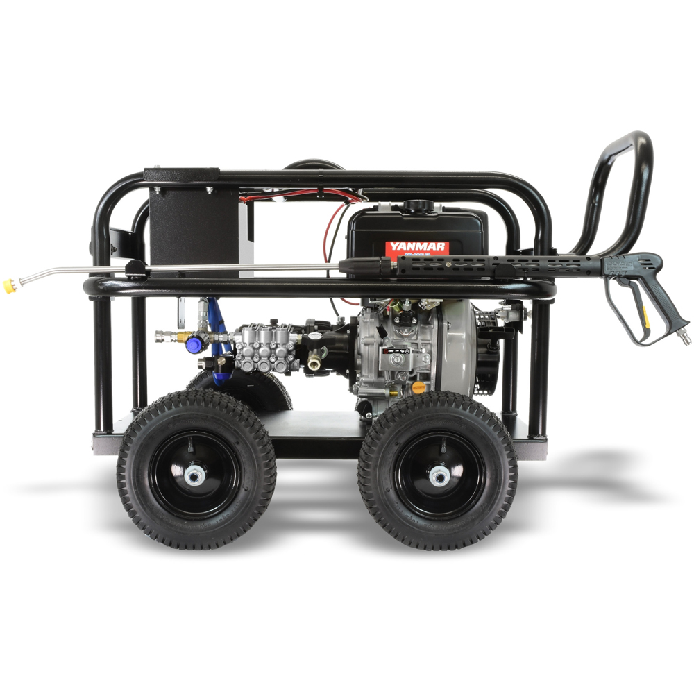 VTUFD10-15200B -Belt Drive upgrade prolongs engine shaft and pump life. A powerful 10HP 3000psi (200BAR) 15L/MIN Trolley Mounted V-TUF Diesel Pressure Washer with electric AND pull start facility. The VTUF D10‘s robust ‘roll cage style’ frame protects the engine and pump from damage in areas which require heavy handling. The ‘roll cage style’ frame has also proved ideal for ease of lifting and maintenance. It has the well proven electric start. The battery of the VTUF D10 is NOT mounted on the engine plate like its competitors, as this shakes the battery apart. It is mounted in a well-protected but accessible area within the top frame. The Yanmar engine and pump of the VTUF D10 is lubricated by the top performing brand V-TUF PRESSURE LUBE PL500 which is known to reduce friction down to near zero and therefore increasing the life of pumps and engines.V-TUF VTUF D10 - This big brute has been designed to thwart all typical factors that destruct heavy duty pressure washers. Feedback from the frontline has been a crucial to the design and choice of components. Field tests have confirmed its reliability. Cutting edge engine technology along with an oversized pump and added reliability features encased in a 'roll cage' chassis makes us confident to guarantee you many hours of industrial cleaning performance along with eco-friendly features. The XHDM400SS has a high water flow of 15 Litres per minute giving it massive rinsing power. Typically used where large areas need cleaning fast such as pig and poultry sheds, barns, spills in factories, ship decks and much more. VTUF D10 - 10HP 3000psi (200BAR) 15L/MIN Trolley Mounted V-TUF Diesel Pressure Washer is one of the most well-built pressure washers on the market. It’s all muscle & great results! BUILT IN BRITAIN! V-TUF D10 s a product of serious collaboration with big end users and is commonly used for heavy duty and demanding tasks. Some of the key features include: Modern ergonomic accessories, oversized pump, thermal protection mobilised by a simple, robust chassis guarantees many hours of enjoyable cleaning performance. V-TUF D10 Pressure Washer comes with 10m hose, DURAKLIX MSQ (Mid-Size Quick Release Coupling) and SSQ (Small-Size Quick Release Coupling), spray gun and lance, detergent injection, plus a selection of four variations of SSQ power clean jets. The V-TUF DURAKILX System makes the hose, trigger, lance and nozzles easy to connect and disconnect with out the need for tools. Now also comes with Turbo Nozzle - Doubles your cleaning power and cleaning speed is 3 times faster than a standard jet. The V-TUF D10 diesel power washer delivers superb performance, has proven reliability, tough build design, 'stay up' foam walled wheels. It is easy to service and adapt, as well as leading the pack with reduced emissions. This is your solution if you are looking for a tough, reliable and manoeuvrable pressure washer! Delivery time: 2 - 3 working days. All machines are Pre-delivery inspected and tested before dispatch. We aim to give you peace of mind, for trouble free operation from the start. SERVICE KITS: PUMP: V-TUF XHDM400SS - Valve kit: VTPKIT2 ; Seal kit: VTPKIT28 ; Pump oil: PL500 Some optional accessories: VTK23810UVYK-HD 10m extension hoses.