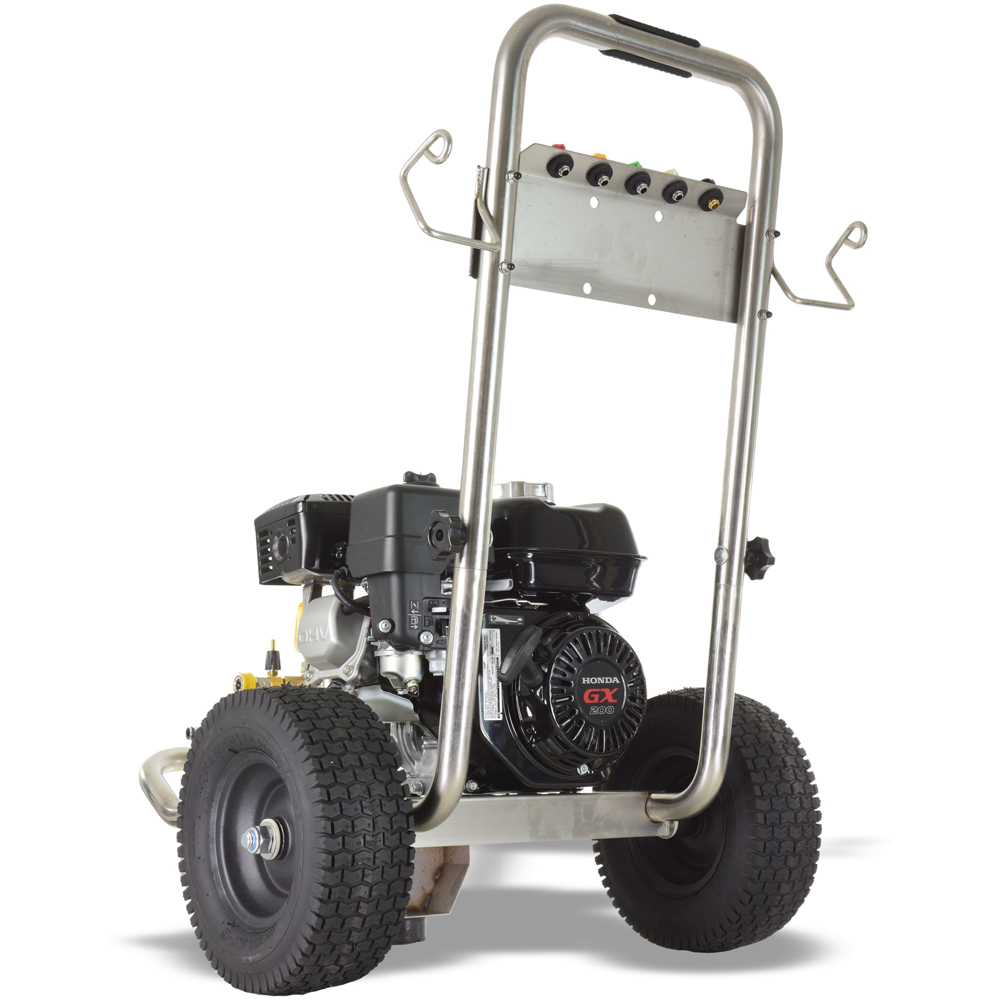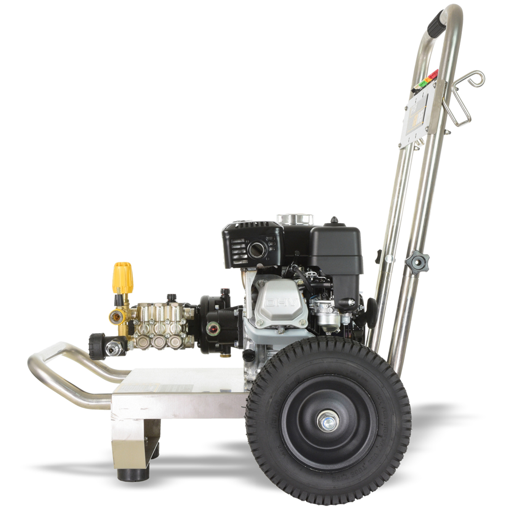 The V-TUF GB065 Honda-powered pressure washer makes light work of removing heavy dirt and grime, for quick, easy, and effective cleaning. GB065 industrial power washers have been developed off the back of popular market needs to handle the toughest cleaning jobs with ease, providing a simple-to-use, mobile, compact, and reliable pressure washer. Using a V-TUF pressure washer with a gearbox greatly increases the life of the pump, and all the wearing parts, saving you time and money on the long-term maintenance. With a strong rigid frame and large wheels, the GB065 can be easily transported across all types of rough terrain. With a powerful 6.5HP Honda engine, providing a high-pressure water supply of 2900psi, the performance of this V-TUF pressure washer always delivers effective cleaning results, wherever required! Key Features: Gearbox Model therefore the pump will last for a lot longer than when directly driven from the engine. V-TUF XHDM300SS SUPER SERIES PUMP Modern Ergonomic Accessories Honda GX200QX Engine High Performance & Low Noise Oversized Pump Thermal Protection Mobilised By A Simple robust chassis Guaranteed many hours of enjoyable cleaning performance! The V-TUF GB065 Honda petrol-powered washer delivers great cleaning power, along with superb results. Offering proven reliability, a tough build, and puncture-proof wheels for rough terrain, as well as leading the pack for the best-rated pressure washer. The V-TUF GB065 gearbox-driven pressure washers make the most demanding cleaning tasks easy, effective, and effortless. With a high volume of power of 2900 psi (200 Bar MAX), 12L/Min, from a petrol 6.5HP Honda Engine, this formidable cleaning workhorse has proven extremely popular for those demanding cleaning jobs. Best known for powerful blasting through the most deep-rooted grime, the V-TUF GB065 was engineered to make cleaning a pleasurable task. With the powerful 6.5HP engine, simple tough design, and hard-wearing components, the GB065 is lubricated with the unique V-TUF Pressure-Lube, therefore providing a guaranteed long lifetime, with very little on-going maintenance. Industries: Construction & Building Sites, Hire & Rental, Car Parks, Parks & Public Walkways, Facilities Management, Manufacturing & Beverage, Heavy Industry, Contract Cleaners, Warehousing & Distribution, Agriculture, Schools & Education Centres, Hospitals. Areas of Application: Construction Site Equipment; Cement Mixers, Diggers, Dumpers, JCB & CAT Machines etc. Cement Plant Foundries, National Multi-Storey Car Parks, Tractors, Harvesters, Cultivators, Ploughs & Trailers, Cattle Barns, Building & Floor Restoration Services, Drain Blasting & Cleaning, Courtyards: Schools, Universities, Hospitals, Shopping Centres, Sports Grounds, Driveways, Paths & Patios, Boats, Yachts & Ships.