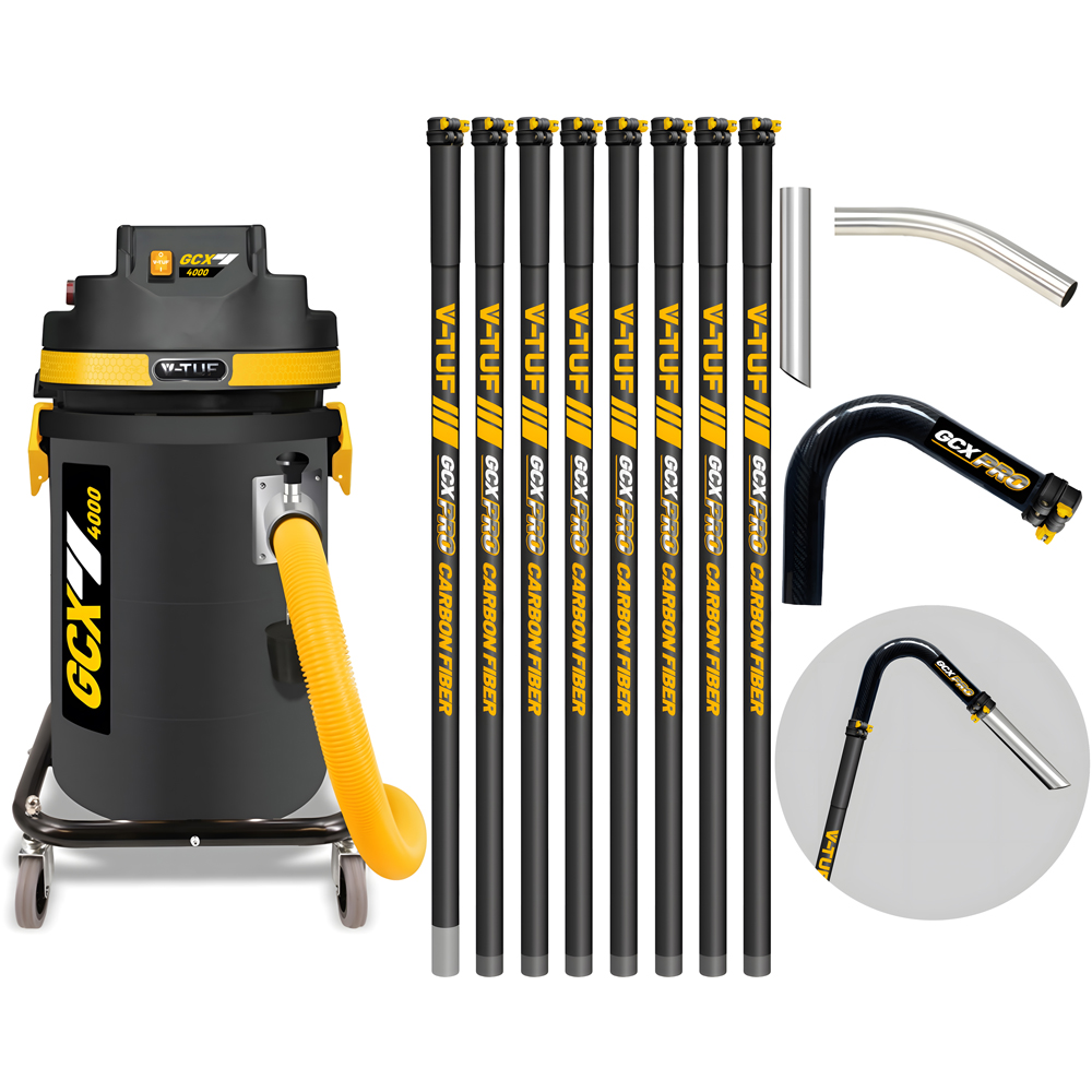 V-TUF GCX4000 - High Performance 1750W 'twin stage' Industrial Motors, that power the large 37L Cyclonic Wet & Dry Vacuum Cleaner, for exceptional results, making cleaning large amounts of dirt hassle free. The 240v GCX4000 is the Best of the Best. Wet And Dry Vacuum Cleaner with twin stage motor gives you solid suction power day in day out, getting the job done in less time. The GCX4000 has a high volume 5 Metre long, 50mm diameter hose so large volumes of dirt can be sucked up quickly. The metal deflector filter prevents the main filter getting clogged up with the dirt as it enters the tank. The aluminium large bore inlet prevents blockages at the entry of the tank. The Aqua-Dry filter which gives you the option for use in both dry and wet applications for cleaning a vast range of materials of liquids, solids, and dust. Simply wash the filter with warm water and continue cleaning. The robust frame with large castor wheels gives you the assurance of a long-lasting heavy-duty vacuum, that is built to withstand the toughest of working conditions, for high demanding tasks. Idea for gutter cleaning, cleaning sludge and slurry out of large drains. With extra attachments the machine can be used for internal high level cleaning, such as warehouses and barns etc.