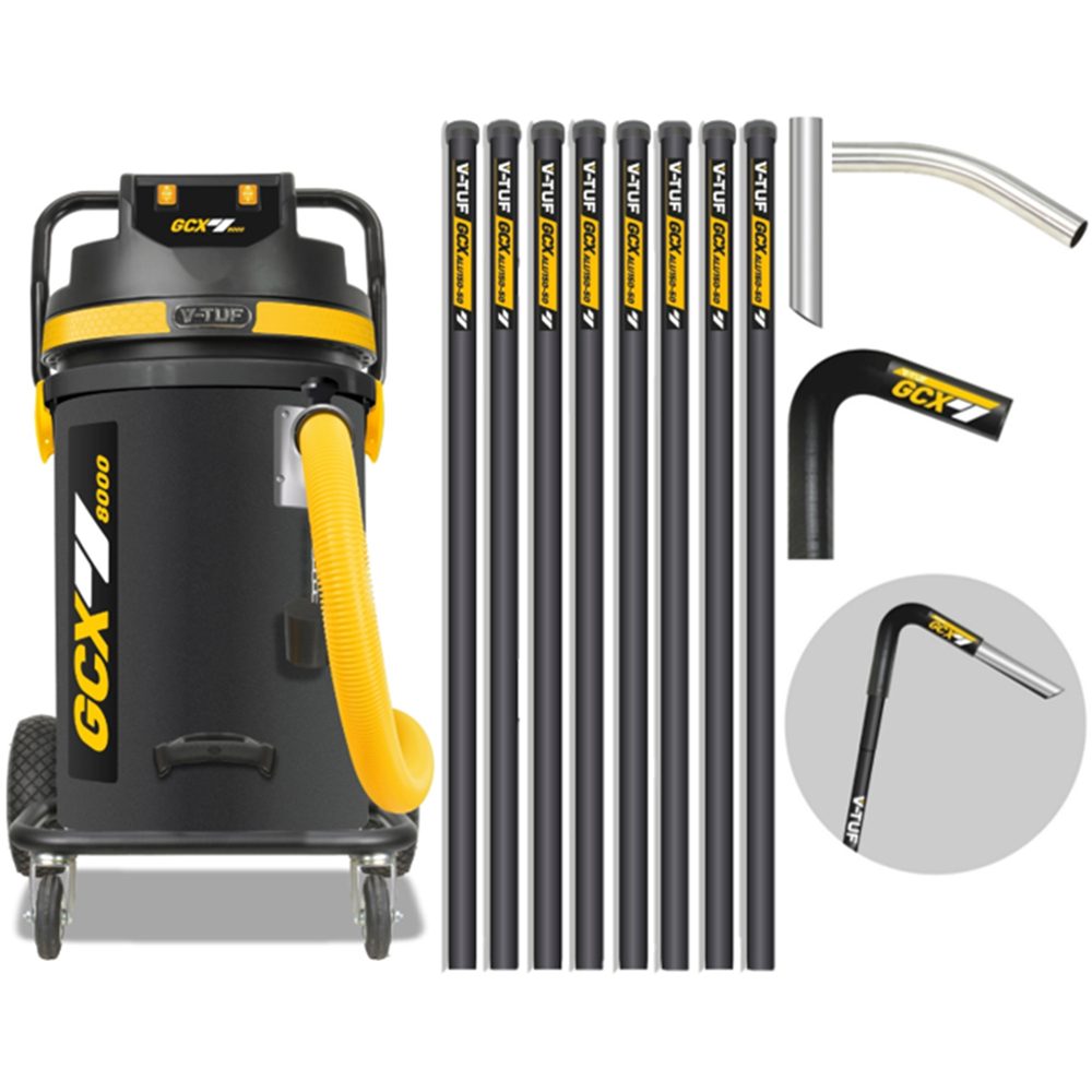 V-TUF GCX8000 - High Performance 3500W 'twin stage' Industrial Motors, that power the large 80L Cyclonic Wet & Dry Vacuum Cleaner, for exceptional results, making cleaning large amounts of dirt hassle free. The 240v GCX8000 is the Best of the Best. Wet And Dry Vacuum Cleaner with 2 independently controlled motors so you can choose your suction power by having any number of motors on at any given time. The GCX8000 has a high volume 5 Metre long, 50mm diameter hose so large volumes of dirt can be sucked up quickly. The metal deflector filter prevents the main filter getting clogged up with the dirt as it enters the tank. The aluminium large bore inlet prevents blockages at the entry of the tank. The Aqua-Dry filter which gives you the op-tion for use in both dry and wet applications for cleaning a vast range of materials of liquids, solids, and dust. Simply wash the filter with warm water and continue cleaning. The robust frame with large all terrain wheels gives you the assurance of a long-lasting heavy-duty vacuum, that is built to withstand the toughest of working conditions, for high demanding tasks. Idea for gutter cleaning, cleaning sludge and slurry out of large drains. With extra attachments the machine can be used for internal high level cleaning, such as warehouses and barns etc.