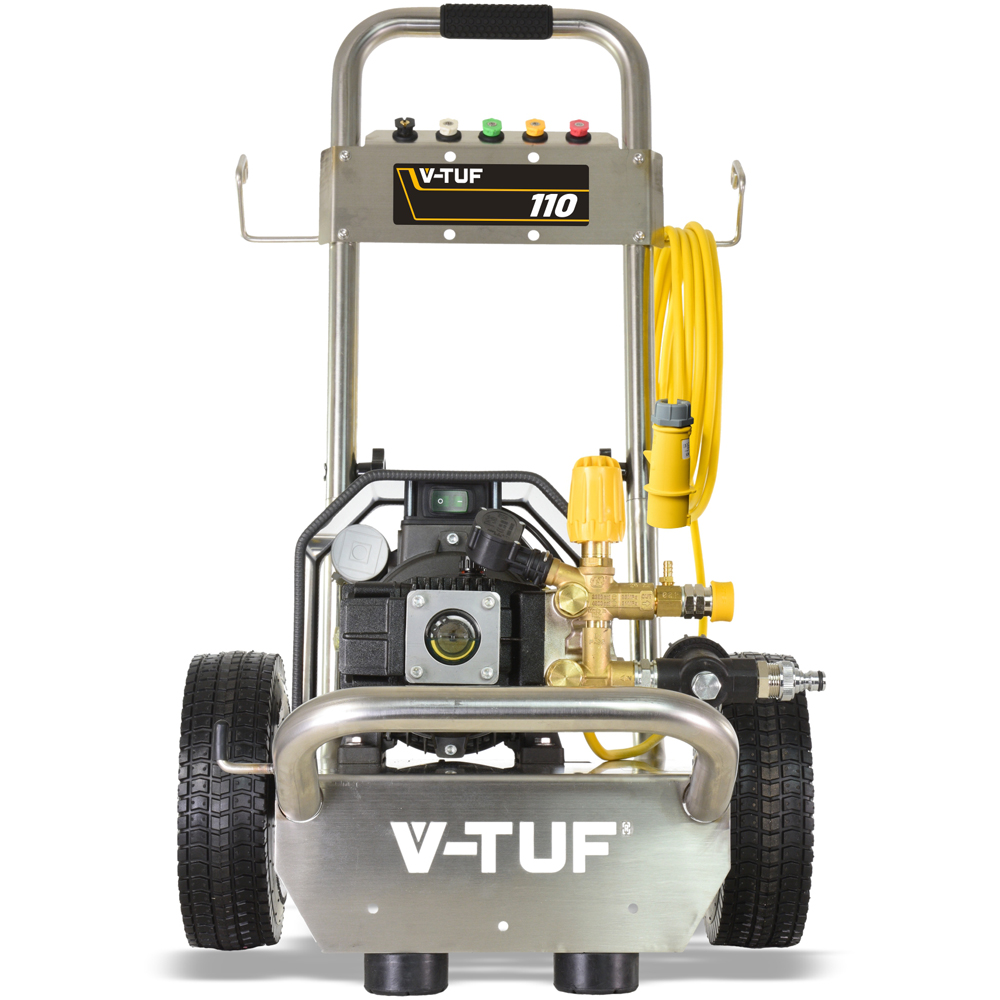 The V-TUF VTUF110 is a stainless steel covered, tough built, well proven, reliable 110Volt Electric Power Washer with the ideal balance of pressure (80 bar / 1500psi) and flow (12 litres per min) on a 110volt electric supply, specifically designed for use on construction sites and for-hire industry. Benefits: Robust Frame with Comfortable Handle. Heavy-Duty Pump and Unloader Valve. Inlet Filter. Chemical Injection. Black Powder Coated Frame. 10" Pneumatic U-Shaped Puncture Proof Wheels. VTUF110 power washers are known for being powerful, versatile, robust, tough, well built, well proven, and a totally reliable 110 Volt Electric Pressure Washer, equipped with an oversized V-TUF triplex pump the machine can suck from a tank or an IBC where a mains water supply might not be in place. The high-pressure blasting turbo nozzle provides even deeper cleaning for performing the most difficult cleaning tasks and can increase the cleaning speed by 3X that of a standard jet. The DuraKLIX System makes the hose, trigger, lance and nozzles easy to connect and disconnect without the need for tools. The compact design with the wide chunky rugged 10 wheels and collapsible handle with comfortable grip makes it highly manoeuvrable across sites and easy to transport in small vans. The low-revving pump and motor unit ensure a long working life, combined with readily available seals and valves and simple rugged electrics which have no expensive circuit boards to replace. Can be used almost anywhere to clean vehicles, plants, machinery, brickwork, gutters, roofs, pathways, driveways, concrete pads and much more. Industries: Construction and Building Sites, Hire and Rental, Car Parks, Parks and Public Walkways, Facilities Management, Manufacturing and Beverage, Heavy Industry, Contract Cleaners, Warehousing and Distribution, Agriculture, Schools and Education Centres, and Hospitals. Areas of Application: Construction Site Equipment; Cement Mixers, Diggers, Dumpers, JCB and CAT Machines etc. Cement Plant Foundries, National Multi-Storey Car Parks, Tractors, Harvesters, Cultivators, Ploughs and Trailers, Cattle Barns, Building and Floor Restoration Services, Drain Blasting and Cleaning, Courtyards: Schools, Universities, Hospitals, Shopping Centres, Sports Grounds, Driveways, Paths and Patios, Boats, Yachts and Ships.