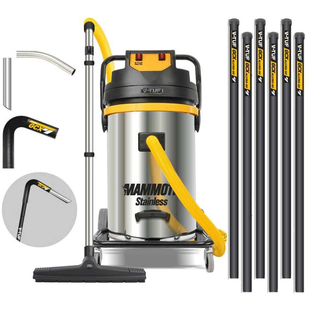 V-TUF MAMMOTH240-STAINLESS has powerful 'twin impeller' motors which are independently switched. This means you can choose your suction power by having any number of motors on at any given time. The V-TUF MAMMOTH240-STAINLESS is Large Capacity Industrial WET & DRY Vacuum Cleaner with a tank drain pipe to easily dump the load if you are sucking heavy material like liquids. There is a variety of filtration methods for various applications (see COMMON SERVICE PARTS and ACCESSORIES below). The MAMMOTH240-STAINLESS comes as standard with a AQUA DRY basket ‘easy to wash’ filter for sucking a broad range of materials from liquid, solids to dust. Some companies keep a spare AQUA DRY filter for a quick change over in busy times. The MAMMOTH240-STAINLESS does not have any expensive circuit boards. 10m, 15m Hose options available. (There is an extra cost for these) No Bags are Required, but if you do want bags the code is VTVS055. Extra Long 5m Cable. Impact Resistant Construction. 6x 1.5m Straight Aluminium Gutter Pole sections; 1x 45 degree flexi elbow; 1x Tough Stainless Steel Gutter nozzle; 2x worm drive clips. Steel Tube standard vacuum lance kit. Quality, replaceable 'two stage' Motors