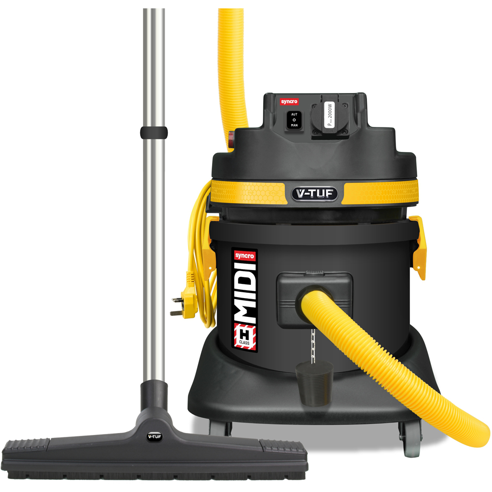 V-TUF MIDI SYNCRO is a compact, robust, H Class, Industrial dust extractor with a 21-litre waste tank. The Syncro feature works in conjunction with your power tool to provide extraction on demand. It comes with a full set of heavy-duty accessories and a pack of bags. Its powerful suction along with H-Class filtration efficiency minimises exposure to harmful dust particles making a safer working environment for all. It monitors the airflow so that the operator knows if the bag is full, or there is a blockage.