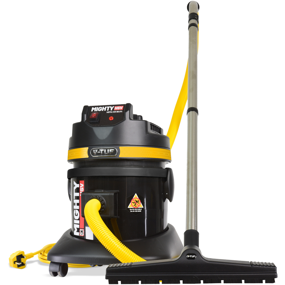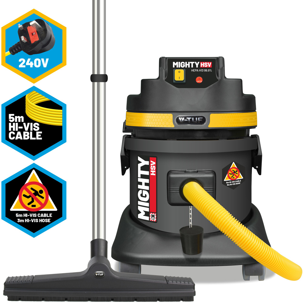 Mighty by name, mighty by nature - the V-TUF MIGHTY HSV M Class Dust Extractors are the UKs popular choice when it comes to a M-Class rated vacuum. Built to withstand the rigour of construction environment. Compact, tough and great performance. New HSV version has been developed from industry feedback with added features to help reduce the risks of slips trips and falls fitted with reflective strips and a visible yellow cable and yellow hose. The V-TF M-Class MIGHTY is lightweight, compact with filtration efficiency for compliant and safe dust extraction throughout your project, providing powerful dust extraction, helping you to tackle the dust at source, ensuring a safe working environment for all. The Universal Power Tool Adaptor & 3M Extraction Hose can be purchased separately:VTVS7024 To help increase awareness and reduce exposure as to harmful airborne particulates, the UK Health and Safety Executive stipulate M-Class rating as the minimum requirement for vacuum cleaners in many industrial applications. Three of the fundamental benefits of M-Class: 1) Effectively extract dust. 2) Contain the dust (ensure it doesn’t become airborne). 3) Safely dispose of the dust. Minimise exposure. Unrated vacuum cleaners can exhaust huge amounts of respirable dust back into your breathing space. While the tiny dust particles are not visible to the naked eye, they remain airborne for hours, meaning people in the area are inhaling hazardous silica dust particles. The V-TUF M-Class MIGHTY HSV has been designed to protect your health and wellbeing and the future of the workforce in hazardous working environments! Always use VTVS7007 Filter bags when operating this vacuum cleaner to remove dust. Effective dust extraction is a cost-effective solution to remove potentially hazardous dusts from the atmosphere while protecting the workforce (that would normally be exposed to openly inhaling harmful particles) and provides a safer environment, with the added benefits of mobility and ease of cleaning. Dust is created when sanding, drilling, demolishing, cutting, sweeping products such as concrete block & bricks, tiles, sandstone, slate, granite slate, limestone & marble. Applicable industries: Construction, Tradesmen, Facilities Management, Manufacturing, Contract Cleaners, Distribution. Areas of Application: House Builders, Warehouse, Floor Restoration Services, Construction Sites, All Builders & Tradesmen, Home Renovation Services, Sanding, Drilling, Demolishing, Cutting, Sweeping, Building Refurbishments, Dusty Workshops, Construction, Refurbishment & Fit Out, New Build Construction, Factory Shavings & Dust.