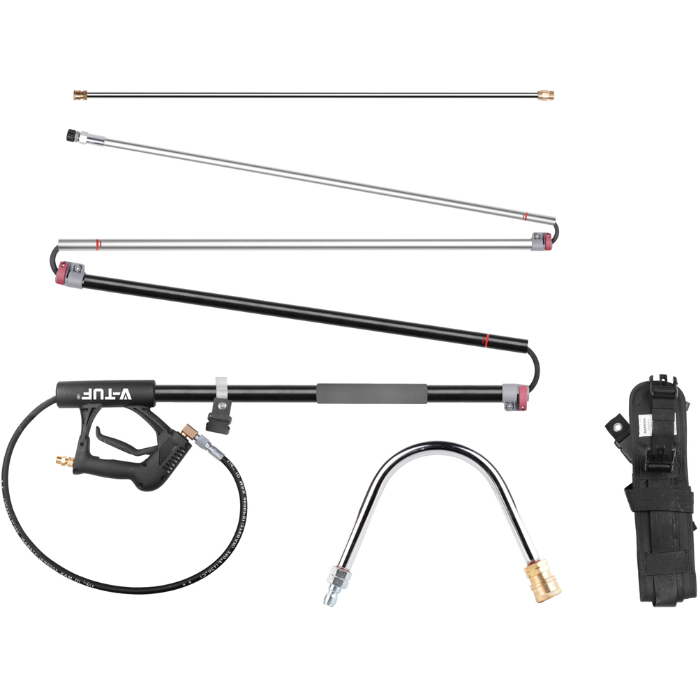 V-TUF HIGH PRESSURE EXTENDABLE TELESCOPIC LANCE – “the safe option when cleaning at height!” Comes with detachable cleaning end tube (M22M x SSQ F) Comes with a gutter cleaning ‘U’ tube end. (M22M x SSQ F) M22F coupling outlet Quick release jet connection – SSQ type Comes with support belt. 275 Bar max pressure 30 Lpm max flow 90°C max temperature Fibreglass & aluminium construction High pressure gun – 3/8F inlet & M22M & MSQ MALE adaptors supplied. Please note: You will need to purchase the correct adaptor to fit your high pressure hose. Note: Due to product development, specifications can change without notice and images are for illustration only. E&OE Ideal for cleaning conservatories, orangeries, cladding, gutters, roofs, solar panels, stone and brickwork. Large vehicles such as lorries, trucks, coaches, busses, trains, trams, large plant, machinery, boats, yachts, ships, and aeroplanes. Just make sure you have the right attachments for the task at hand such as V-TUF surface cleaners, soft wash kits, turbo nozzles, chemicals and detergents. For mossy roofs use with V-TUF D-GREEN. Common wearing parts: Telescopic end coupling set: 1x MFB12/06 ; 1x MFB06/04 ; 1x W6 ; 1x B14.1014 'U' Lance for gutter cleaning: 1x T2.059U ; 1x B14.1111 ; 1x B14.9180SS Lance for forward cleaning: 1x T2.059 ; 1x B14.1111 ; 1x B14.9180SS.