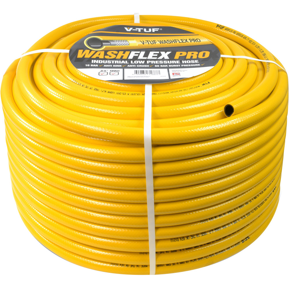 WASHFLEX PROFESSIONAL WATER HOSE BF34 is a popular anti-kink industrial hose pipe (an ideal pressure washer feed hose). It is also used in agricultural hose applications and by the discerning user as a quality garden hose. WASHFLEX PROFESSIONAL WATER HOSE BF34 is a WINNER due to its durability, flexibility, wear-resistant outer skin and anti-crush design. WASHFLEX PRO WATER HOSE has a working pressure of 10 bar ideal hose to connect to taps with standard mains pressure or low pressure. The hose has been tested to burst at 50 bar (five times the recommended working pressure). The internal diameter of the WASHFLEX BF34 hose is 19mm and the outside diameter is 24.5mm. WASHFLEX BF34 hose is compatible with DURAKLIX KCQ, NSQ, GKC and Hozelock style fittings which fit the Tricoflex and Hozelock anti-kink hose. WASHFLEX BF34 is highly flexible with an excellent bend radius and remains flexible in freezing conditions. WASHFLEX BF34 is a phthalate-free, phenol-free, phytotoxic-free material (plant-friendly material) and is made from virgin materials which is the secret of its durability. The WASHFLEX BF34 is REACH-approved which ensures that the water and environment are not contaminated. WASHFLEX BF34 is manufactured in Great Britain.