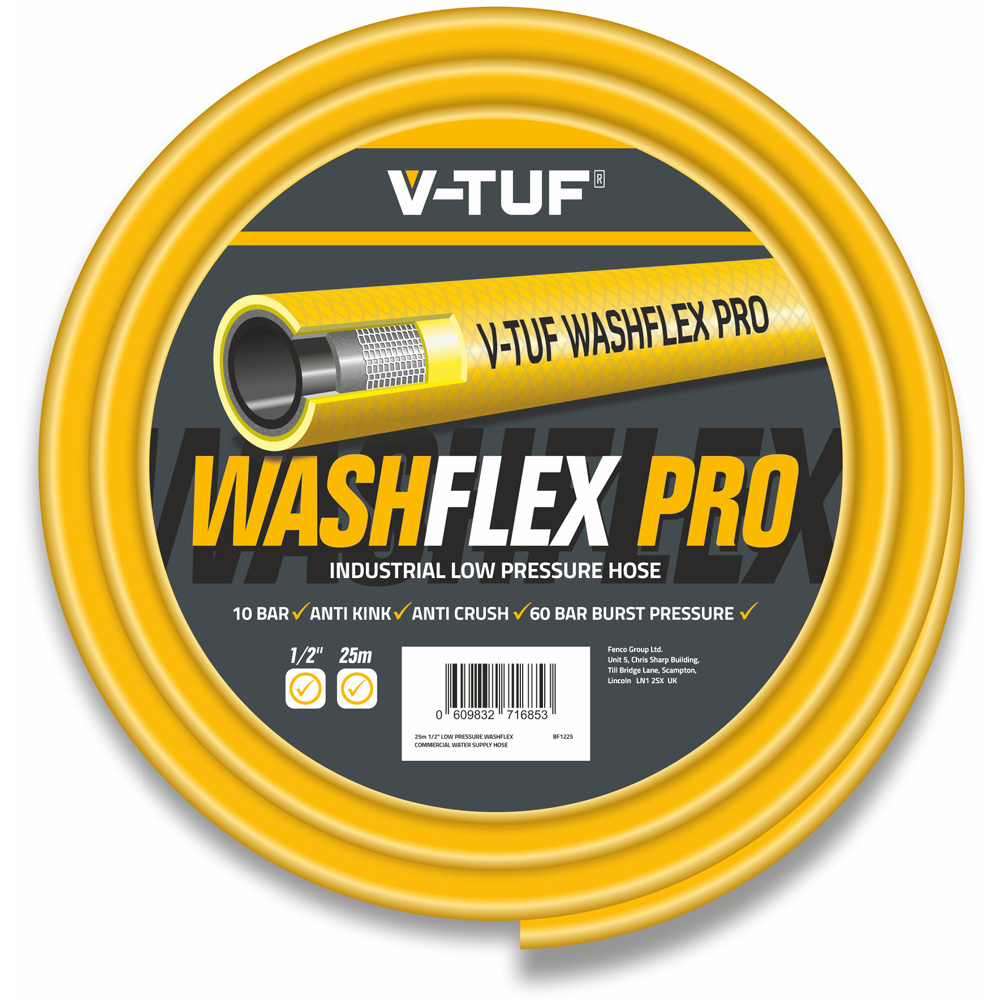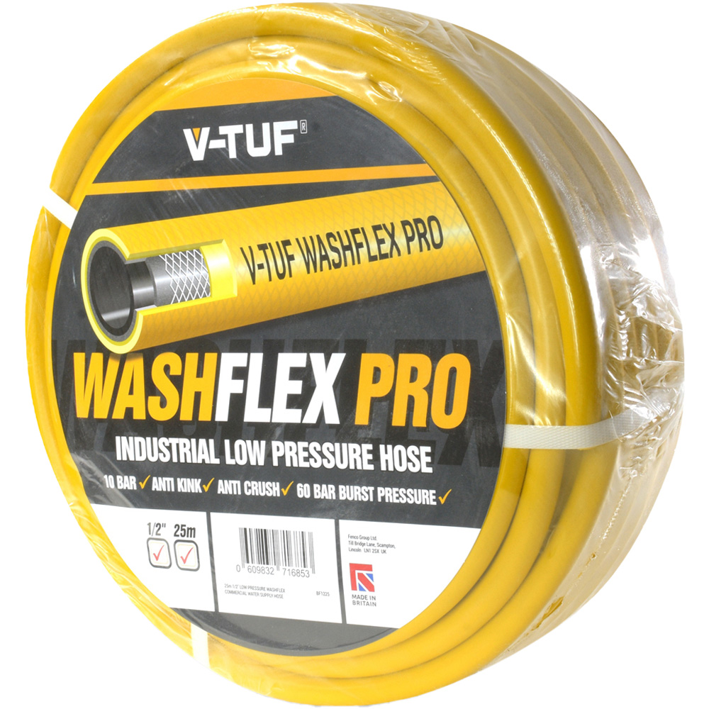 The V-TUF WASHFLEX PRO WATER HOSE BF12 is a popular anti-kink industrial hose pipe (an ideal pressure washer feed hose). It is also used in Agricultural & Horticultural hose applications, such as draglines, watering and by the discerning user as a quality garden hose. WASHFLEX PRO WATER HOSE BF12 is a WINNER due to its durability, flexibility, wear-resistant outer skin and anti-crush design. WASHFLEX PRO WATER HOSE has a working pressure of 10 bar ideal hose to connect to taps with standard mains pressure or low pressure. The hose has been tested to burst at 50 bar (five times the recommended working pressure). The internal diameter of the WASHFLEX BF12 hose is 12.5mm and the outside diameter is 17.5mm. WASHFLEX BF12 hose is compatible with DURAKLIX KCQ, NSQ, GKC and Hozelock style fittings which fit the Tricoflex and Hozelock anti-kink hose. WASHFLEX BF12 is highly flexible with an excellent bend radius and remains flexible in freezing conditions. WASHFLEX BF12 is a phthalate-free, phenol-free, phytotoxic-free material (plant-friendly material) and is made from virgin materials which is the secret of its durability. The WASHFLEX BF12 is REACH-approved which ensures that the water and environment are not contaminated. WASHFLEX BF12 is manufactured in Great Britain.
