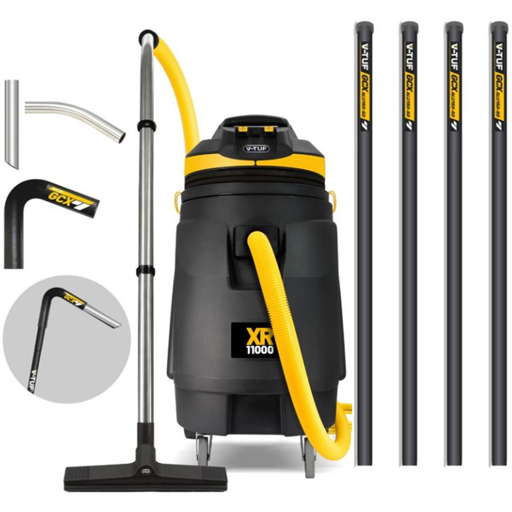 The Large, Rugged, Durable commercial Wet & Dry XR11000 Vacuum Cleaner has proven to be the best rated dirt cleaning companion, in a huge range of applications, from cleaning up flooded buildings, to building restoration services, and general site clear up. The 240v XR11000 is an elite Wet And Dry Vacuum Cleaner with dual powered independently controlled powerful 'twin impeller' turbine motors so you can choose your suction power by having any number of motors on at any given time. The washable filters which gives you the option for use in both dry and wet applications for cleaning a vast range of materials of liquids, solids, and dust. Simply wash the filter with warm water and continue cleaning. The robust high impact Rota moulded tank gives you the assurance of a long-lasting heavy-duty vacuum, that is built to withstand the toughest of working conditions, for high demanding tasks. With our unique V-TUF high-efficiency HEPA washable filter system which provides extra protection to the motors from dust. To clean the filters, wash the filter with warm water, letting it dry, and use it again and again. The XR11000 is the professional’s choice on choosing the best wet and dry vac, with the huge capacity of a 110L tank, long life motors, being the effective cleaning companion to anyone needing to remove wet and dry substances. The features on this machine are answers to the requests of the cleaning market for a large industrial, bagless 'all-rounder' vacuum cleaner, that is easy to manoeuvre, and able to cope with vacuuming a mixture of wet and dry material, such as drain unblocking, flood & spill restoration, carpet cleaning, car valeting, and general garage, and workshop cleaning jobs, and all jobs needing a super powerful suction. It also has a drain hose for easy disposal of liquids - at the rear of the tank. If you do need bags you can order VTVS055 Industries: • Facilities Management, • Contract Cleaners, • Manufacturing, • Retail & Shopping Centres, • Schools, Universities & Colleges, • Warehousing & Distribution, • Leisure Centres, • Engineering, • Restaurants & Cafes, • Automotive Workshops, • Agriculture. Areas of Application: • Hard Floor Cleaning, • Carpet Cleaning, • Unblocking Sinks, • Extracting Moisture From Curtains & Furniture, • Carpet & Upholstery Spot Cleaning, • Cleaning a Garage/Workshop, • Clearing up Broken Glass, • Clean up Liquids / Spillages, • Vacuum Pet Hair, • Ventilation Cleaning, • Office Cleaning, • Gutter Cleaning, • Exhibition Main Hall Cleaning, • Farm Buildings & Grain Barns, • Flood & Spill Restoration. USEFUL TIP: How to maintain and clean your artificial grass lawn. ARTIFICIAL GRASS LAWN cleaning & maintenance. Use the V-TUF vacuum with the sweeping head moving up and down (like you push your lawn mower) which lightly agitates and sucks out a build up of dirt in the grass. This will keep your turf looking fresh. You can vacuum in wet or dry conditions. If the artificial turf has a lot of leaves or debris, ‘sweep’ the debris into piles with the vacuum sweeper head. Hose your lawn down with water a couple of times a year or when necessary. We recommend the V-TUF WASHFLEX PRO Hose to do this. The British weather will do the rest! If you choose to use a pressure washer to clean the grass we suggest you spray the grass gently using the SSQ BLACK LP jet. The V-TUF V5 Pressure Washer is an example. Do not try cleaning the grass like you would a patio as this could damage the grass fibres and could also damage the base of the lawn