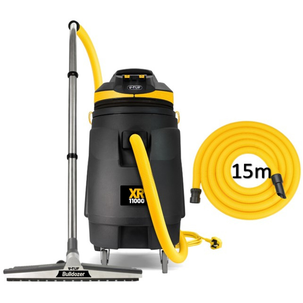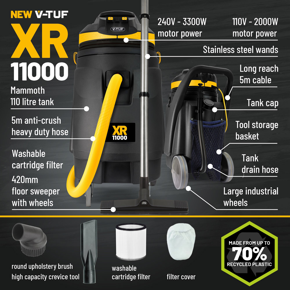 The Large, Rugged, Durable commercial Wet & Dry XR11000 Vacuum Cleaner has proven to be the best rated dirt cleaning companion, in a huge range of applications, from cleaning up flooded buildings, to building restoration services, and general site clear up. The 240v XR11000 is an elite Wet And Dry Vacuum Cleaner with dual powered independently controlled powerful 'twin impeller' turbine motors so you can choose your suction power by having any number of motors on at any given time. The washable filters which gives you the option for use in both dry and wet applications for cleaning a vast range of materials of liquids, solids, and dust. Simply wash the filter with warm water and continue cleaning. The robust high impact Rota moulded tank gives you the assurance of a long-lasting heavy-duty vacuum, that is built to withstand the toughest of working conditions, for high demanding tasks. With our unique V-TUF high-efficiency HEPA washable filter system which provides extra protection to the motors from dust. To clean the filters, wash the filter with warm water, letting it dry, and use it again and again. The XR11000 is the professional’s choice on choosing the best wet and dry vac, with the huge capacity of a 110L tank, long life motors, being the effective cleaning companion to anyone needing to remove wet and dry substances. The features on this machine are answers to the requests of the cleaning market for a large industrial, bagless 'all-rounder' vacuum cleaner, that is easy to manoeuvre, and able to cope with vacuuming a mixture of wet and dry material, such as drain unblocking, flood & spill restoration, carpet cleaning, car valeting, and general garage, and workshop cleaning jobs, and all jobs needing a super powerful suction. It also has a drain hose for easy disposal of liquids - at the rear of the tank. If you do need bags you can order VTVS055 Industries: • Facilities Management, • Contract Cleaners, • Manufacturing, • Retail & Shopping Centres, • Schools, Universities & Colleges, • Warehousing & Distribution, • Leisure Centres, • Engineering, • Restaurants & Cafes, • Automotive Workshops, • Agriculture. Areas of Application: • Hard Floor Cleaning, • Carpet Cleaning, • Unblocking Sinks, • Extracting Moisture From Curtains & Furniture, • Carpet & Upholstery Spot Cleaning, • Cleaning a Garage/Workshop, • Clearing up Broken Glass, • Clean up Liquids / Spillages, • Vacuum Pet Hair, • Ventilation Cleaning, • Office Cleaning, • Gutter Cleaning, • Exhibition Main Hall Cleaning, • Farm Buildings & Grain Barns, • Flood & Spill Restoration. USEFUL TIP: How to maintain and clean your artificial grass lawn. ARTIFICIAL GRASS LAWN cleaning & maintenance. Use the V-TUF vacuum with the sweeping head moving up and down (like you push your lawn mower) which lightly agitates and sucks out a build up of dirt in the grass. This will keep your turf looking fresh. You can vacuum in wet or dry conditions. If the artificial turf has a lot of leaves or debris, ‘sweep’ the debris into piles with the vacuum sweeper head. Hose your lawn down with water a couple of times a year or when necessary. We recommend the V-TUF WASHFLEX PRO Hose to do this. The British weather will do the rest! If you choose to use a pressure washer to clean the grass we suggest you spray the grass gently using the SSQ BLACK LP jet. The V-TUF V5 Pressure Washer is an example. Do not try cleaning the grass like you would a patio as this could damage the grass fibres and could also damage the base of the lawn