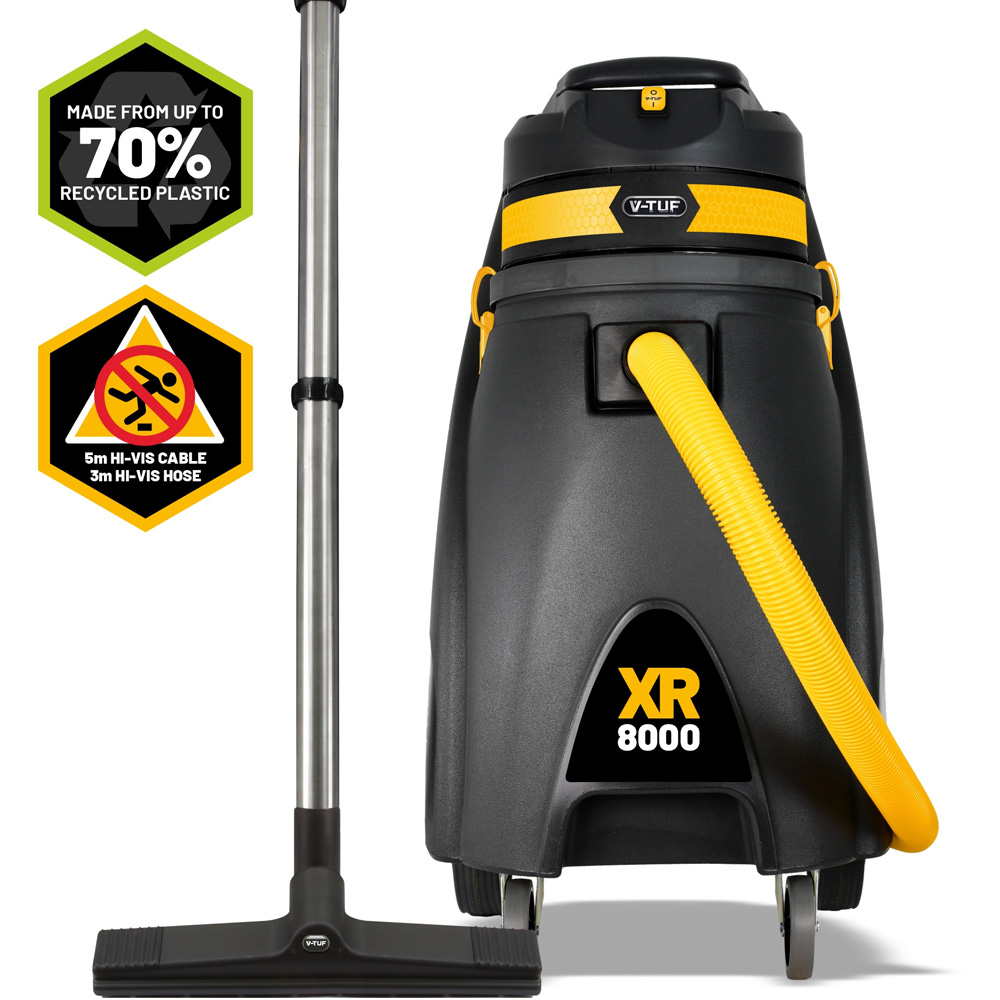 The 110v XR8000 is an elite Wet And Dry Vacuum Cleaner with a powerful 'twin impeller' turbine motor. The Washable filters give you the option for use in both dry and wet applications for cleaning a vast range of materials of liquids, solids, and dust. Simply wash the filter with warm water and continue cleaning. The robust high impact Roto-moulded tank gives you the assurance of a long-lasting heavy-duty vacuum, that is built to withstand the toughest of working conditions, for highly demanding tasks. With our unique V-TUF high-efficiency HEPA washable filter system provides extra protection to the motors from dust. To clean the filters, wash the filter with warm water, let it dry, and use it again and again. The XR6000 is the professional’s choice on choosing the best wet and dry vac, with the huge capacity of a 60L tank, and long life motors, being the effective cleaning companion to anyone needing to remove wet and dry substances. The features of this machine are answers to the requests of the cleaning market for a large industrial, bagless 'all-rounder' vacuum cleaner, that is easy to manoeuvre and able to cope with vacuuming a mixture of wet and dry material, such as drain unblocking, flood & spill restoration, carpet cleaning, car valeting, and general garage, and workshop cleaning jobs, and all jobs needing a super powerful suction. It also has a drain hose for easy disposal of liquids - at the rear of the tank. If you do need bags you can order VTVS055. Industries: • Facilities Management, • Contract Cleaners, • Manufacturing, • Retail & Shopping Centres, • Schools, Universities & Colleges, • Warehousing & Distribution, • Leisure Centres, • Engineering, • Restaurants & Cafes, • Automotive Workshops, • Agriculture