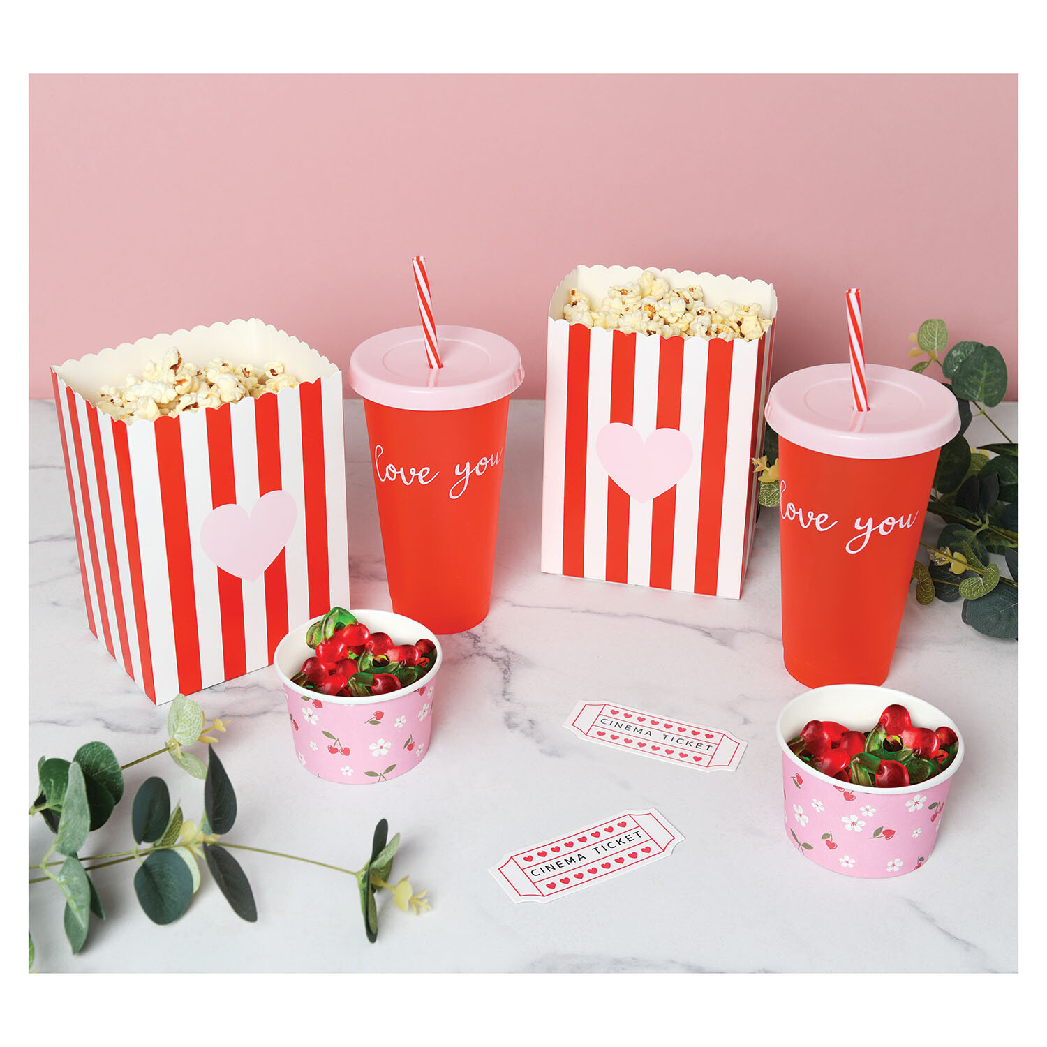 Set the scene and host the most magical date night from the comfort of your own home this Valentine's with this Valentine's Movie Night Kit. Features cups with straws, popcorn bags, sweet cups and adorable cinema ticket props, this charming kit is perfect for serving up your favourite snacks when you cuddle up and enjoy a movie.