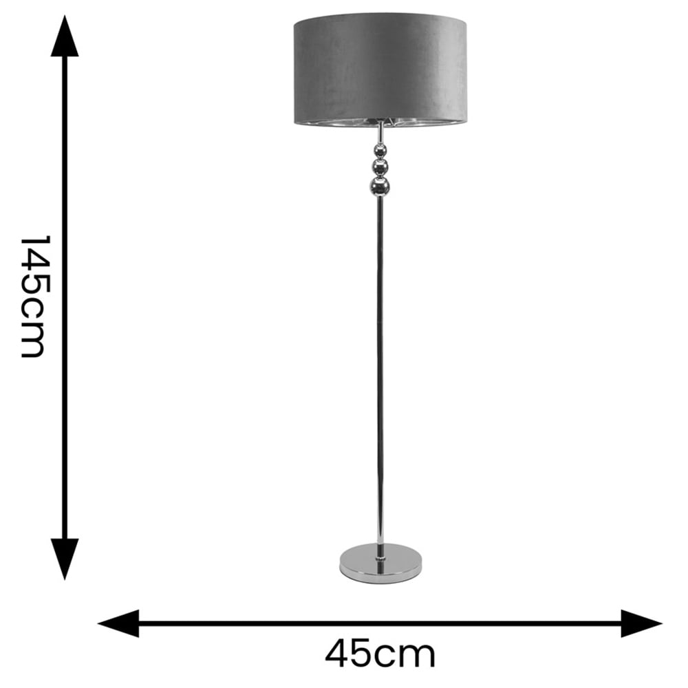 She’s beauty and she’s grace, she’ll brighten up your space. The Marissa chrome floor lamp features a chic, streamlined design with stacked globes perched at the top of its slender stem. Its effortlessly stylish vibe fits perfectly in various modern settings, whether you lean towards minimalism or an industrial aesthetic. Finished with a luxurious grey velvet lampshade that boasts a chrome interior, this metal floor lamp is a space-saving gem packed with style. Dimensions - Height 145cm x Width 45cm x Depth 45cm.