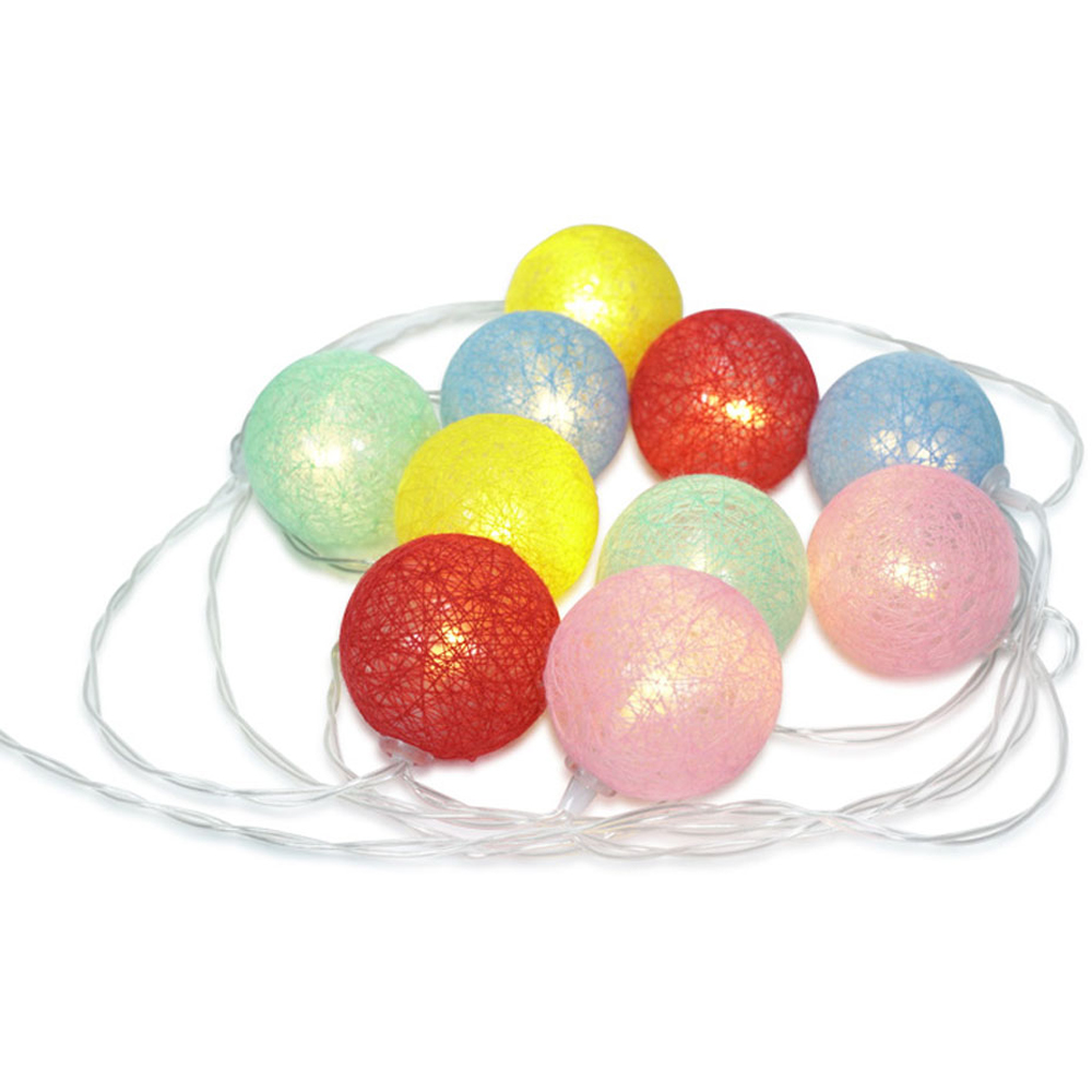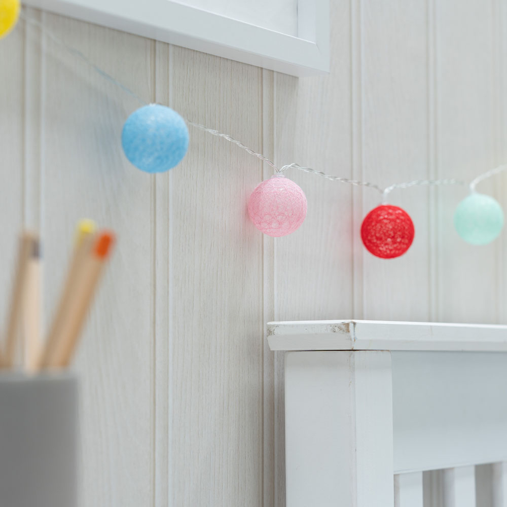 Create a more stylish and brighter living space with the ValueLights 10 Multicolour LED Cotton Balls String Lights. These fairy string lights are perfect for helping your little ones drift off to sleep. They consist of 10 warm white LEDs and are powered by three AA batteries (not included), with an on/off button on the battery pack. Measuring 144cm long (including cable), they can be easily placed in nurseries, playrooms, on tables, and around bedframes to add a cosy feel to your home. Once illuminated, these lights create a super-effective ambience.