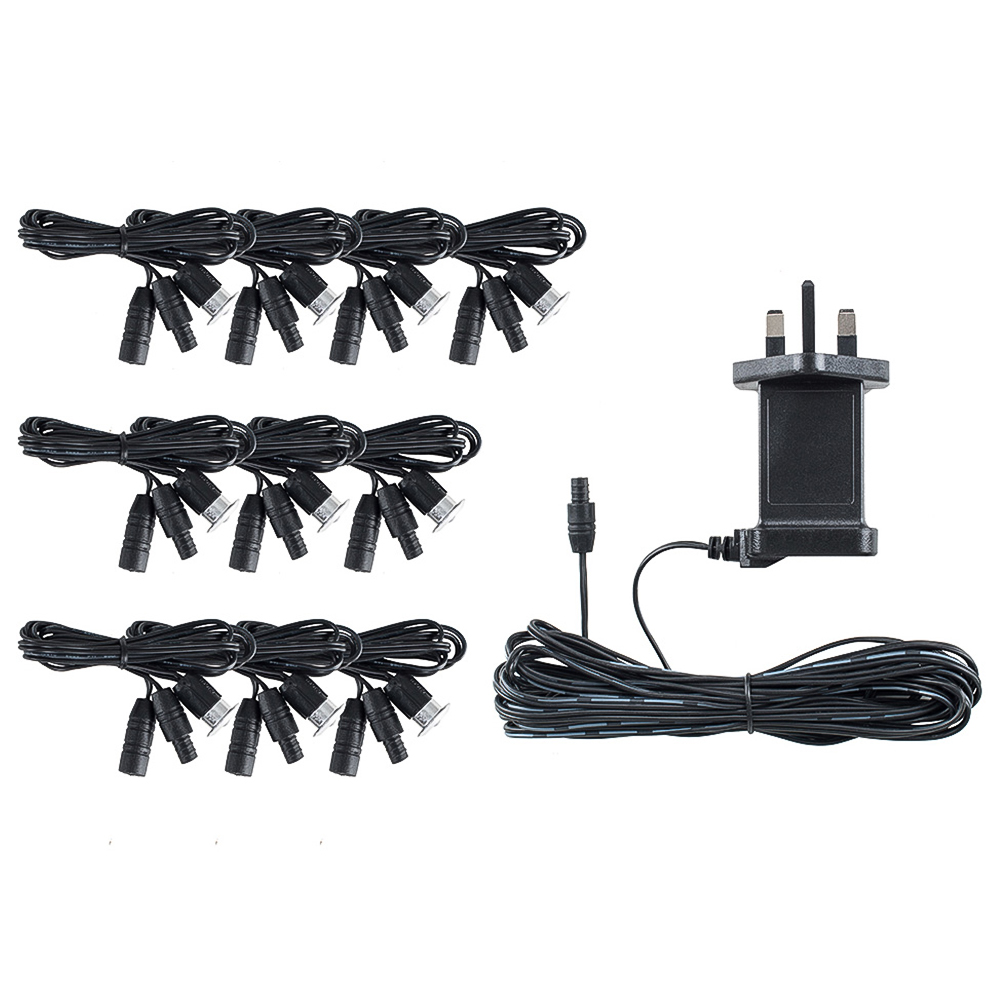 Elevate your ambience with the ValueLights 10 Pack Silver Round Warm White LED Decking Kitchen Plinth Light. This complete stainless steel lighting solution includes all bulbs, cables, and connections you need to upgrade your space. This kit features 10 x 15mm LED decking lights spaced 1m apart with a 5m cable from the transformer to the first light. It also includes a transformer with a mains plug for indoor power connection and has an IP67 outdoor rating for durability and performance.