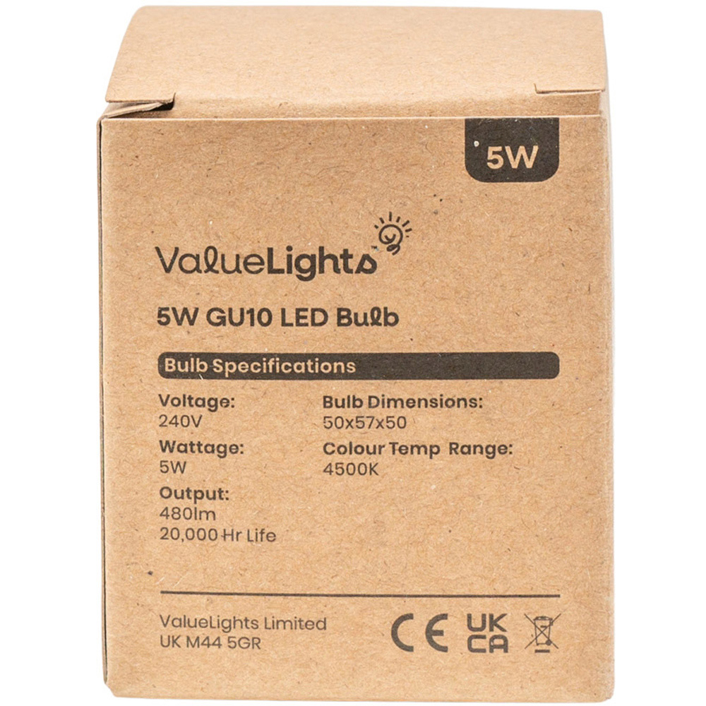 These ValueLights 5W 4500K GU10 Cool White Spotlight LED Light Bulb 10 Pack are made to top standards, making them a reliable choice for replacing old halogen lamps. They’re non-dimmable, thermal plastic-bodied GU10 bulbs, perfect for spotlights, wall lights, and downlights. Great for spaces like kitchens, dining rooms, living rooms, hallways, bedrooms, and more!