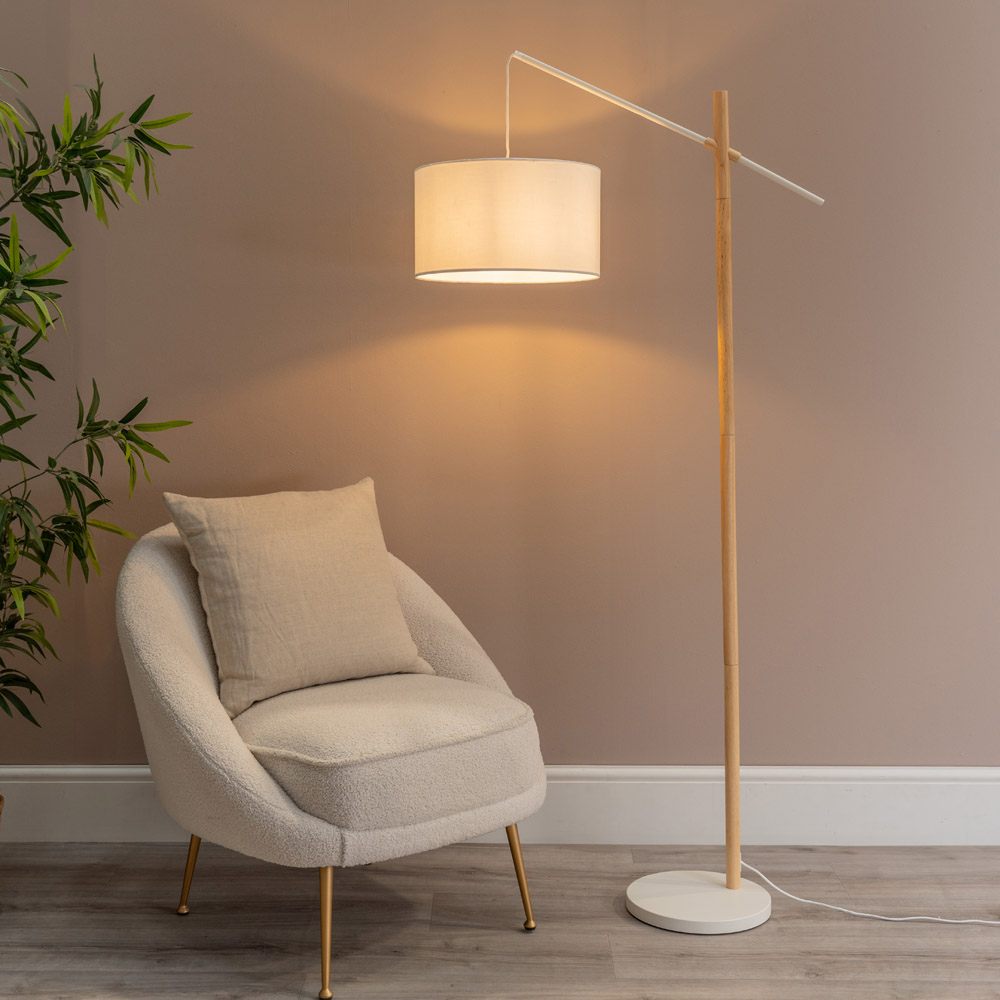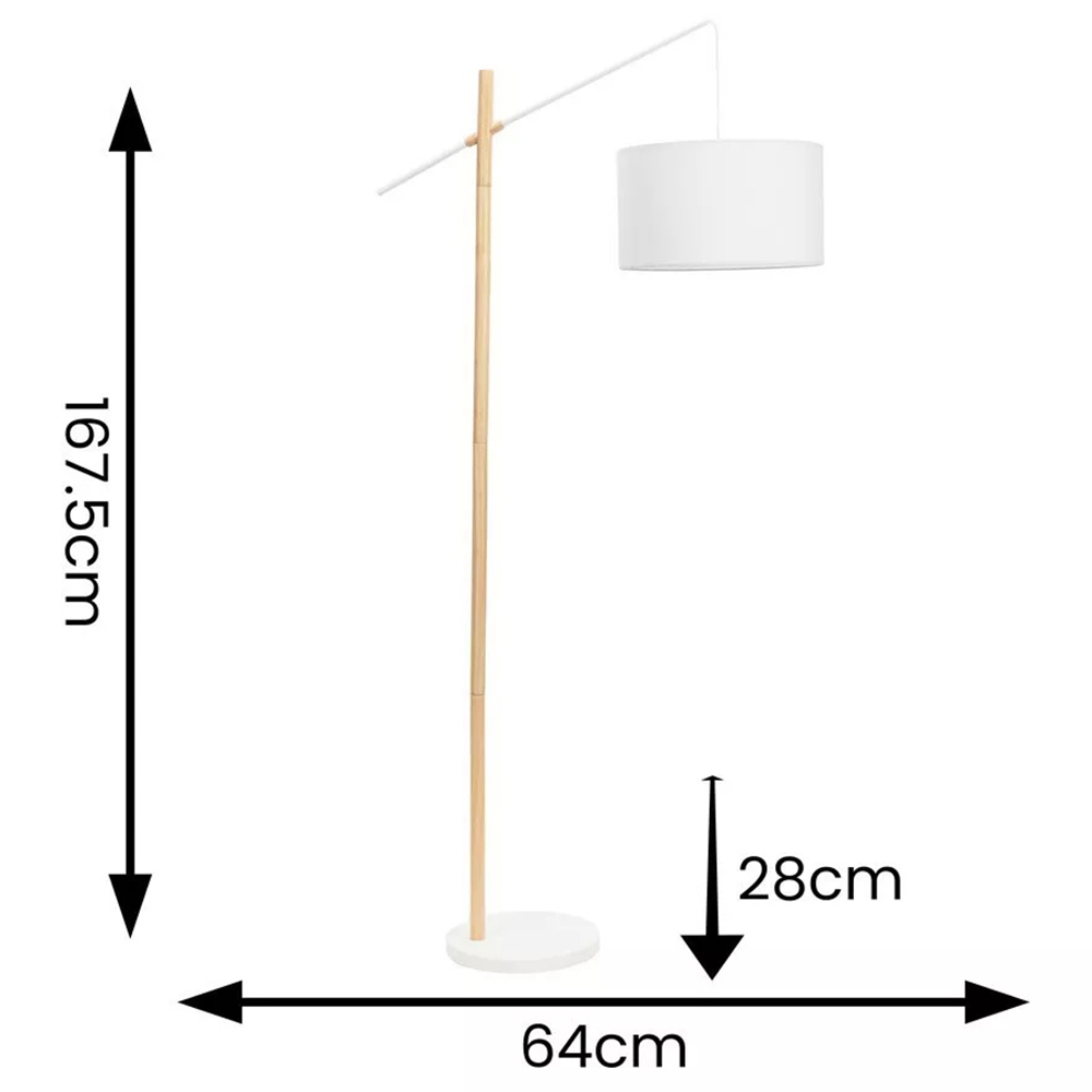 The Adrianna wooden arch floor lamp is super stylish and sleek, making it a great addition to any contemporary space, particularly in Japandi or Scandi-themed homes. Its light wood finish beautifully complements the white drum lampshade, arch stem and round base, while the white braided cord adds to the overall sense of quality. Perfect for illuminating bedrooms and enhancing living rooms, it also features a handy foot switch and 1.8m lead cable. Dimensions - Height 167.5cm x Width 64cm x Depth 28cm