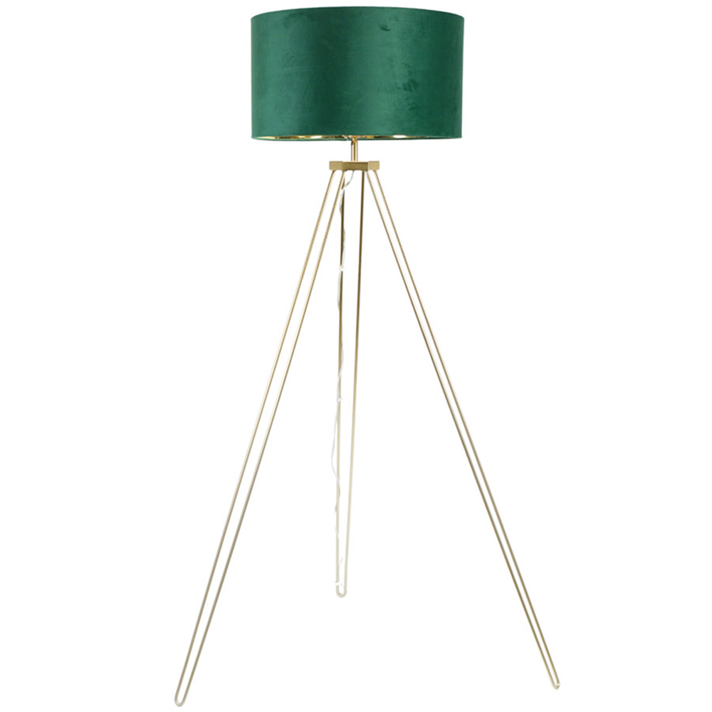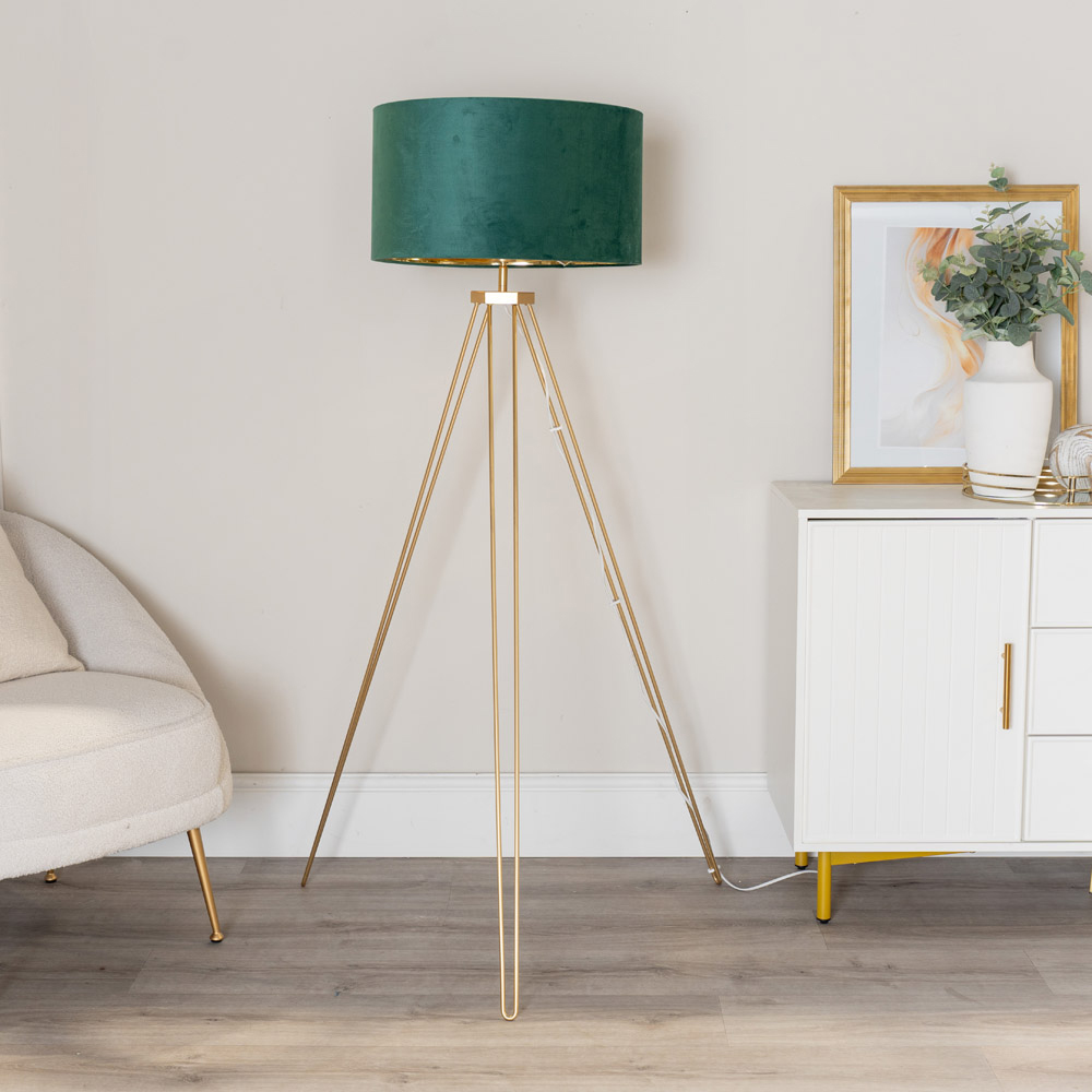 Step aside, Gatsby, it's all about the Aero now! This lamp oozes mid-century charm and roaring 20s flair, complete with chic gold metal hairpin legs. The lamp is paired beautifully with a velvet drum shade in green and has a stunning metallic gold inner. Think mingling with the high society crowd, and planning weekend yacht outings. Plus, this stylish gold tripod floor lamp comes with a handy foot switch for easy on and off.