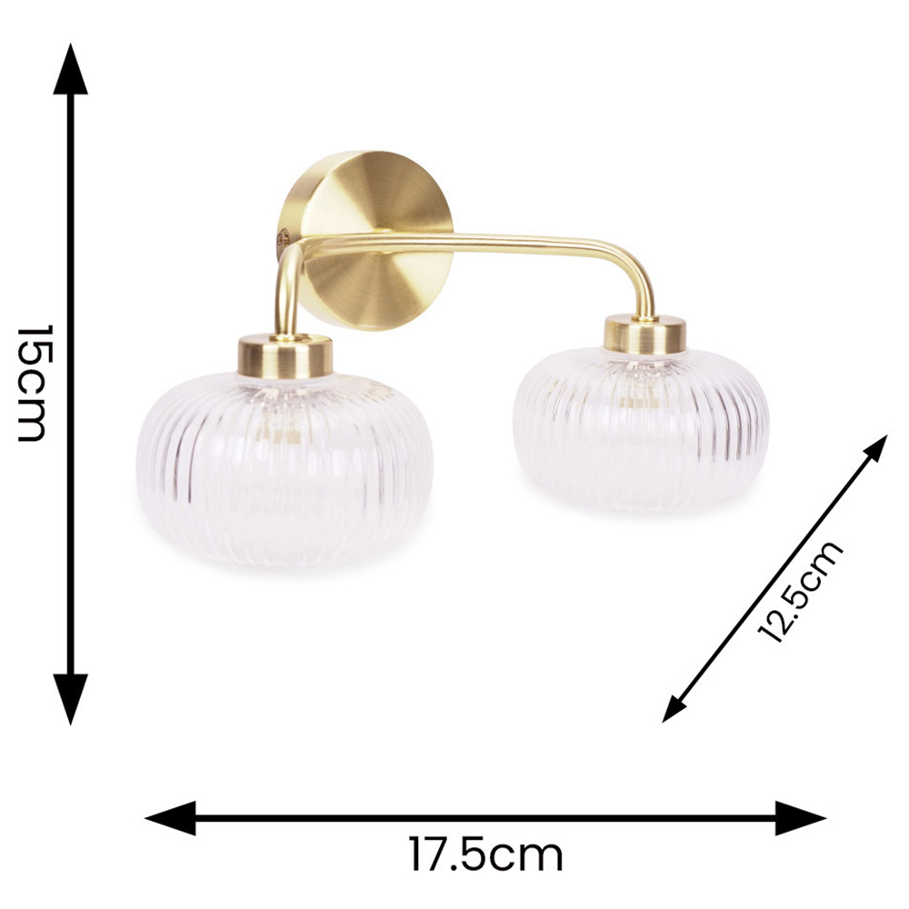 Illuminate your space with this pair of two way wall lights. Suiting any living room, bedroom, bathroom or reading nook this dual wall light features statement metal in a gold finish with clear glass shades. The ribbed glass shades not only provide a stylish look but also diffuses the light softly, creating a cosy atmosphere. With a perfect balance of style and functionality, this light brings a touch of modern glamour to any space. Dimensions - H16.5 x W32 x D17cm.