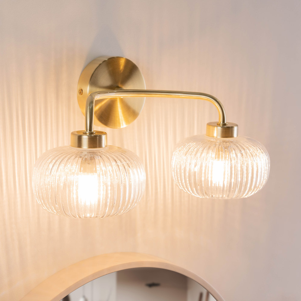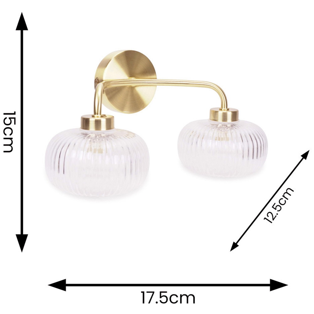 Illuminate your space with this two way wall light fitting. Suiting any living room, bedroom, bathroom or reading nook this dual wall light features statement metal in a gold finish with clear glass shades. The ribbed glass shades not only provide a stylish look but also diffuses the light softly, creating a cosy atmosphere. With a perfect balance of style and functionality, this light brings a touch of modern glamour to any space. Dimensions - H16.5 x W32 x D17cm.